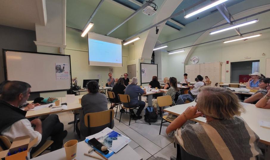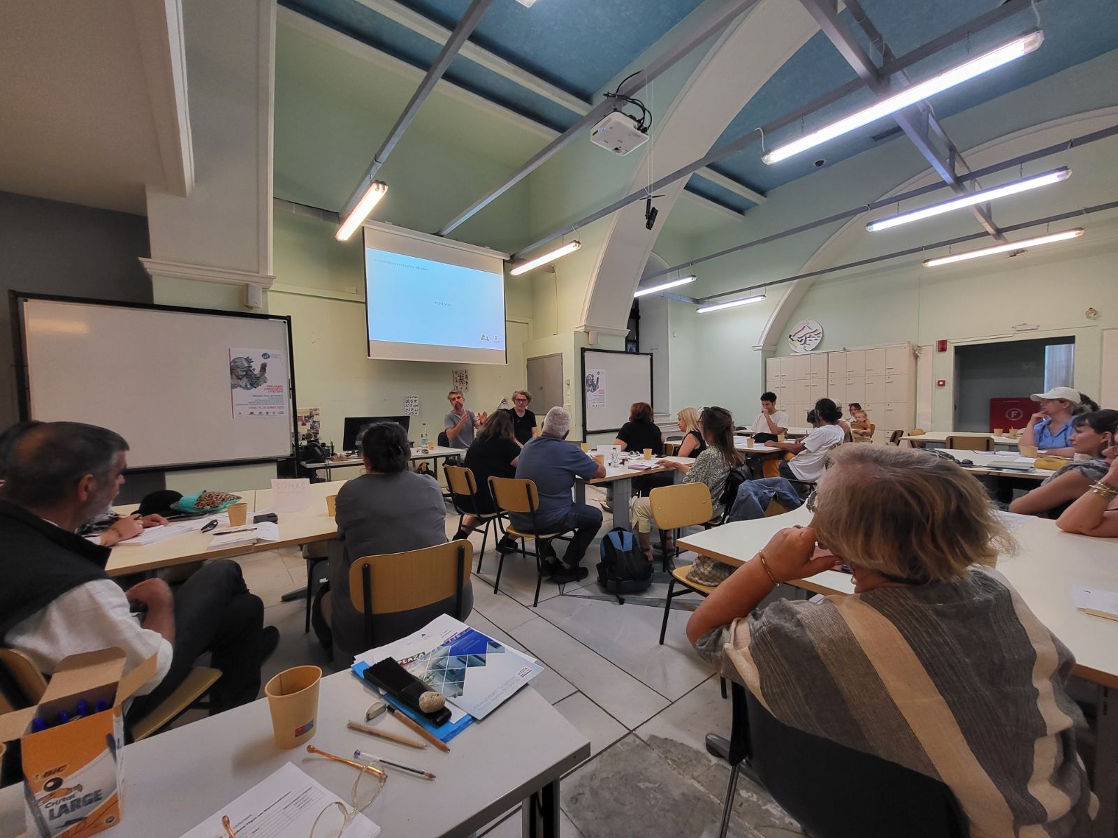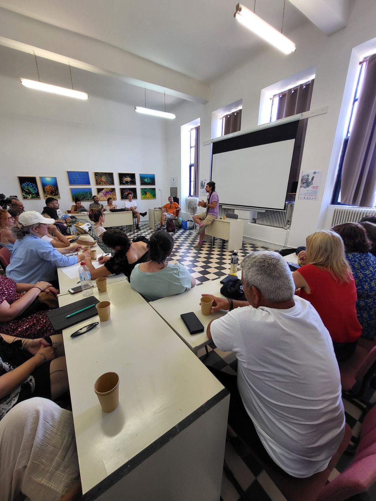 Οι εισηγητές κ. Θανάσης Χουλιαράς - Υποψήφιος Διδάκτορας Δημόσιου Χώρου και Σύγχρονου Οπτικού Πολιτισμού στο Τμήμα ΕΜΜΕ του ΕΚΠΑ - επιμελητής, κ. Κλεομένης Κωστόπουλος - Καλλιτεχνικός Διευθυντής του ArtWalk (Διεθνές Street Art Festival Patras) και κ. Πάρις Ξυνταριανός - Τσιροπινάς - Υποψήφιος Διδάκτορας Τμήματος Μηχανικών Σχεδίασης Προϊόντων και Συστημάτων του Πανεπιστημίου Αιγαίου - καλλιτέχνης του δρόμου και μέλος της Ομάδας Έργου του προγράμματος «Οι Τοίχοι Που Μιλάνε» της Αναπτυξιακής Εταιρείας Κυκλάδων, άνοιξαν έναν πολυφωνικό διάλογο για την ανάγκη για πολιτισμική στρατηγική στη δημόσια τέχνη, την ενεργοποίηση της κοινωνίας των πολιτών, την απουσία νομικού πλαισίου και τα θεσμικά κενά της street art, την έννοια του τοπικού και συλλογικού έργου τέχνης.
