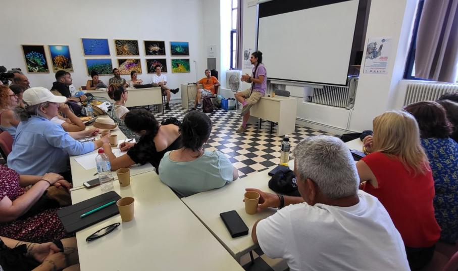 Για δύο μέρες, εκπρόσωποι Ομάδων Τοπικής Δράσης, καλλιτέχνες, εικαστικοί που εργάζονται στην Πολιτιστική Δημιουργική Βιομηχανία από όλη την νησιωτική Ελλάδα - από τη Λήμνο και τη Σάμο μέχρι τα Χανιά, τα Δωδεκάνησα και τις Κυκλάδες - συναντήθηκαν στη Σύρο για να συζητήσουν την παραγωγή δημόσιας τέχνης στα νησιά, τις νομικές και θεσμικές προκλήσεις, αλλά και τη σημασία της συμμετοχής της κοινότητας στη δημιουργία street art έργων με τοπικό αποτύπωμα.