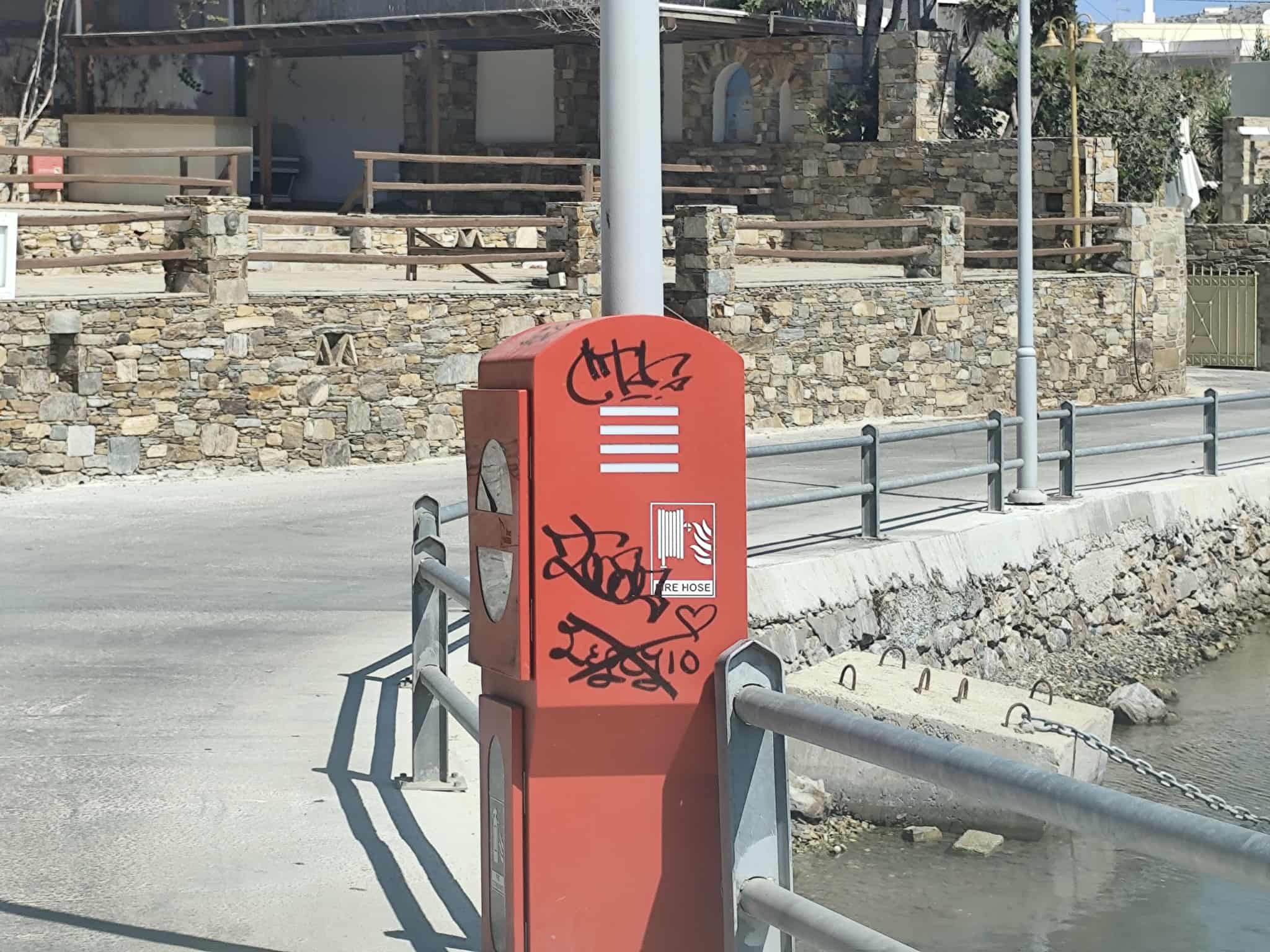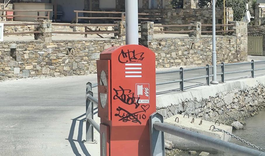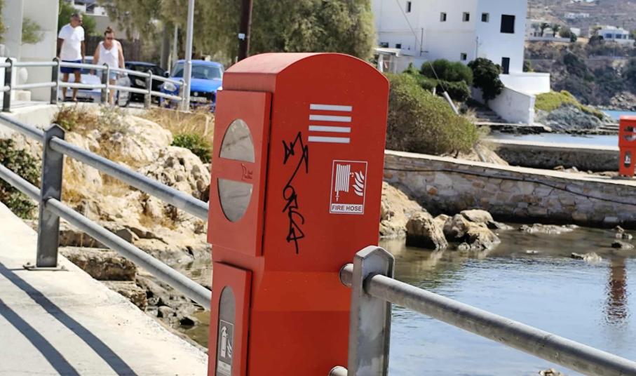 Βαμμένες με ανεξίτηλα χρώματα από σπρέι είναι οι πυροσβεστικές φωλιές κατά μήκος της παραλιακής ζώνης, στο ύψος του καταφυγίου σκαφών στον Φοίνικα Σύρου, καθώς αυτό το καλοκαίρι, άγνωστοι δεν σεβάστηκαν τον νέο εξοπλισμό που τοποθέτησε το Λιμενικό Ταμείο Σύρου.