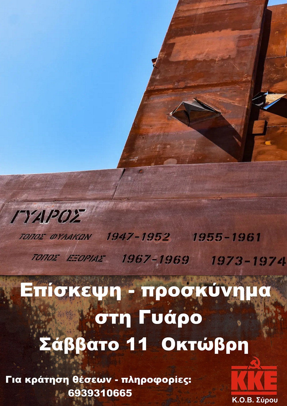 Το Σάββατο 11 Οκτώβρη θα πραγματοποιηθεί η επίσκεψη - προσκύνημα στην Γυάρο που διοργανώνει η Κεντρική Επιτροπή του ΚΚΕ.