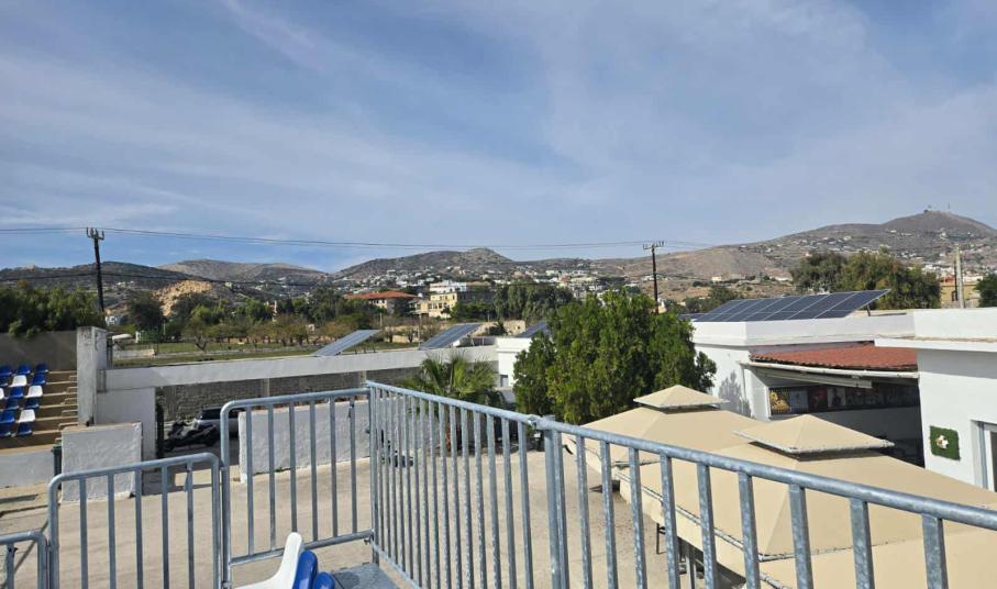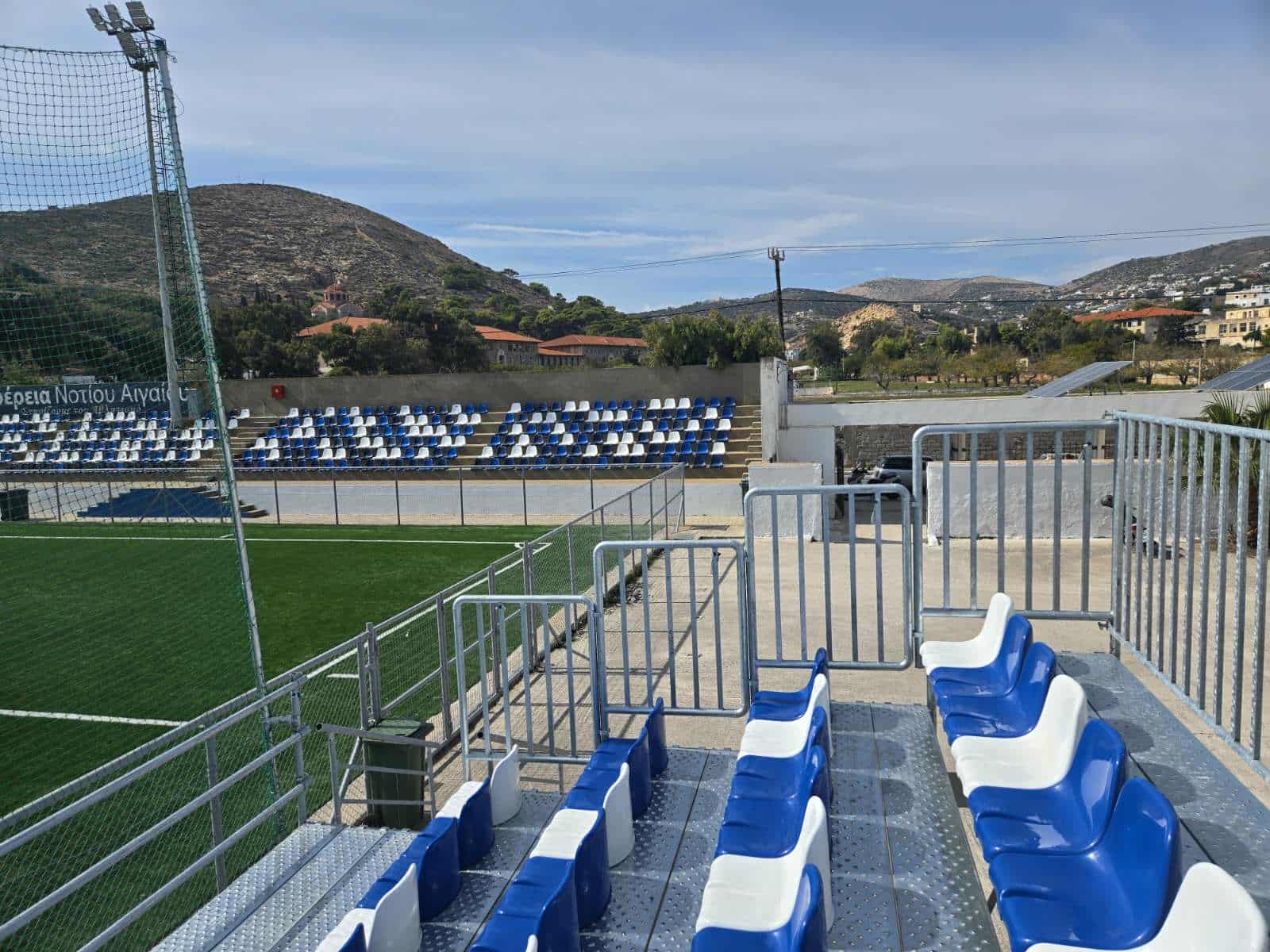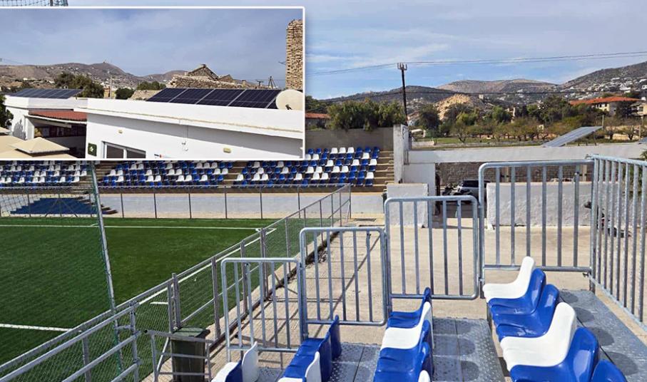 Πρόκειται για 20 φωτοβολταϊκά που έχουν τοποθετηθεί στη στέγη των εγκαταστάσεων του γηπέδου ποδοσφαίρου απέναντι από το στρατόπεδο Σύρου, με τα οποία ενισχύθηκε η ΕΠΣ Κυκλάδων για τη συγκεκριμένη υποδομή, από τον αναπληρωτή υπουργό Αθλητισμού, Γιάννη Βρούτση, στα τέλη του 2023. Σε συνέντευξη Τύπου μάλιστα, ο κ. Βρούτσης είχε γνωστοποιήσει πως πρόκειται για ένα συνολικό έργο πανελλαδικά, που θα καλύψει 32 γήπεδα των ΕΠΣ στο κομμάτι της ενεργειακής αναβάθμισής τους.