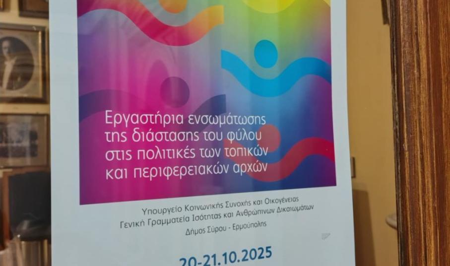 Το εργαστήριο “Ενσωμάτωσης της διάστασης του φύλου στις πολιτικές των τοπικών και περιφερειακών αρχών: Αρχές, σκοπιμότητα και αντίστοιχα εργαλεία”, φιλοξενεί από χθες στους χώρους του, ο Δήμος Σύρου - Ερμούπολης.