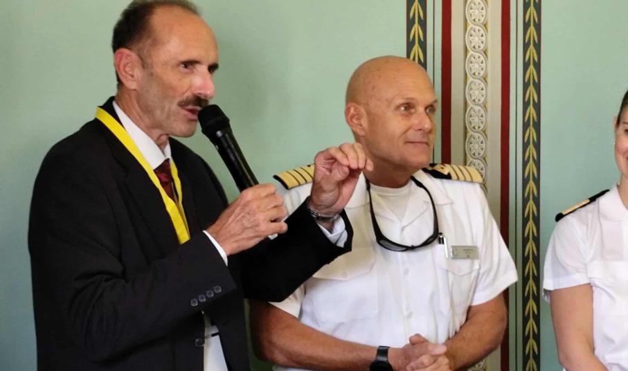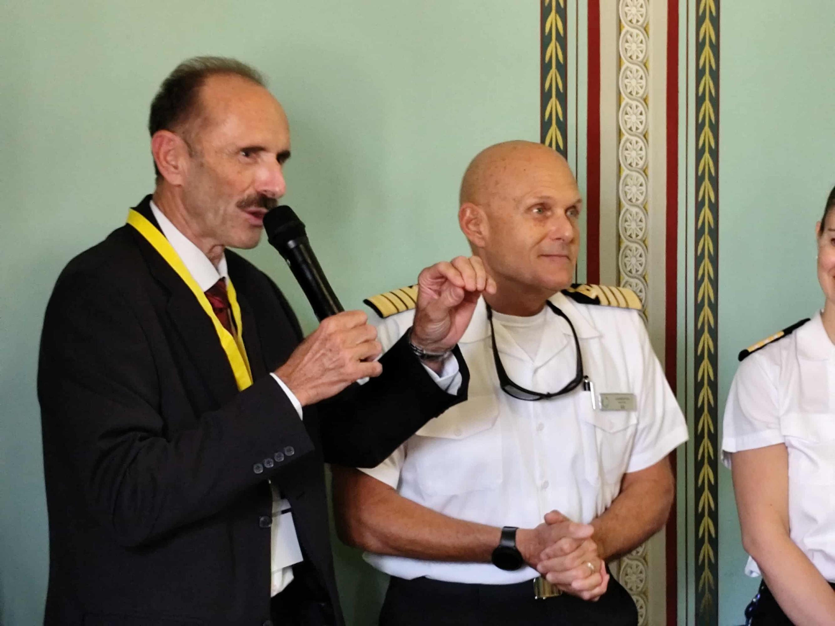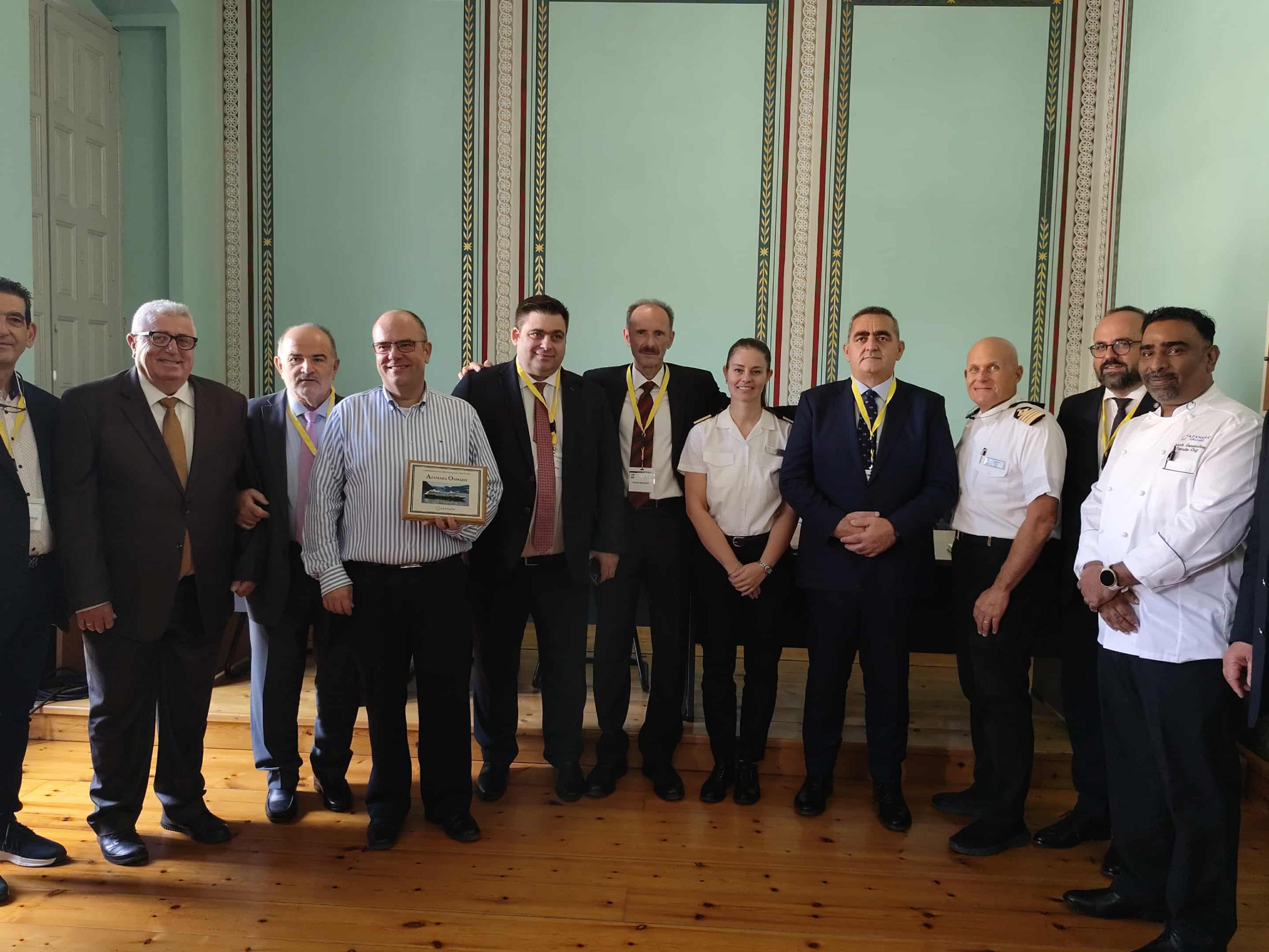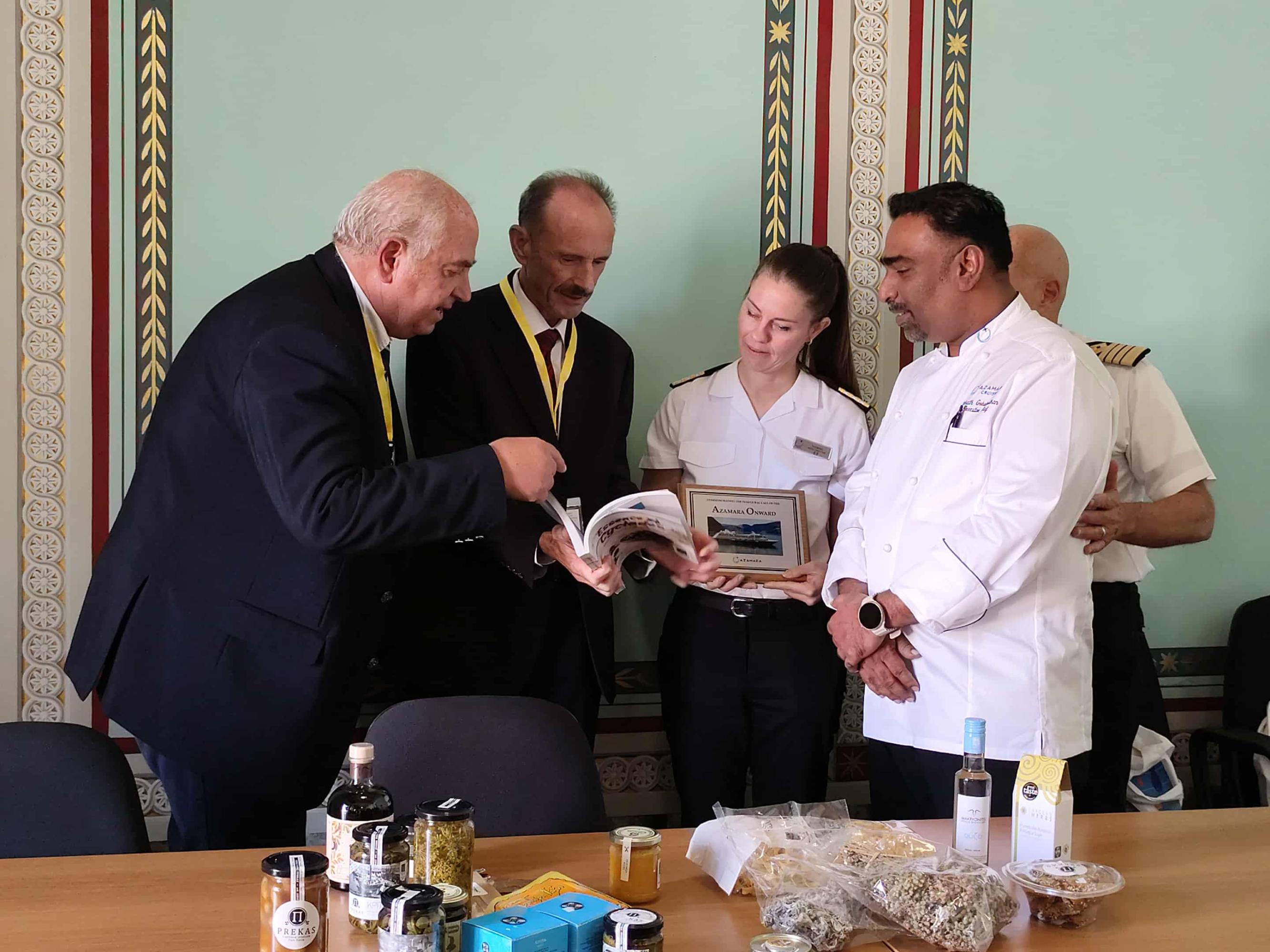 Ιδιαίτερη στιγμή στο διήμερο, αποτέλεσε και η συνάντηση του Επιμελητηρίου Κυκλάδων με τον καπετάνιο και τον σεφ του κρουαζιερόπλοιου AZAMARA ONWARD για να παρουσιαστούν προϊόντα που μπορεί να εντάξει στα πολυτελή εστιατόριά της η εν λόγω εταιρεία. “Συναντήσαμε τον καπετάνιο, τη διευθύντρια του ξενοδοχειακού και τον σεφ και τους παρουσιάσαμε τα προϊόντα που μπορούν να χρησιμοποιούν στα πολυτελή εστιατόριά τους, οι εταιρείες κρουαζιέρας. Όταν ο επισκέπτης πληρώνει 1.500 ευρώ την ημέρα, νομίζω πως είναι πολύ σημαντική η σκέψη όταν περνούν από το Αιγαίο και τις Κυκλάδες να παίρνουν οι σεφ τοπικά προϊόντα καθώς για τα συγκεκριμένα εστιατόρια είναι μικρότερες οι ποσότητες και μπορούν να καλυφθούν”, ανέφερε, γνωστοποιώντας πως η εταιρεία AZAMARA “μας ζήτησε κατάλογο από τοπικά προϊόντα της Σύρου για αρχή, ώστε να παίρνουν οι σεφ όταν προσεγγίζουν και να τα μετατρέπουν σε ξεχωριστά πιάτα για τα πολυτελή εστιατόριά τους”. Ο κ. Ρούσσος έκλεισε τις δηλώσεις του, λέγοντας πως “αυτό που επιτύχαμε με την συγκεκριμένη εταιρεία, θέλουμε να το επιτύχουμε και με άλλες εταιρείες κρουαζιέρας”.