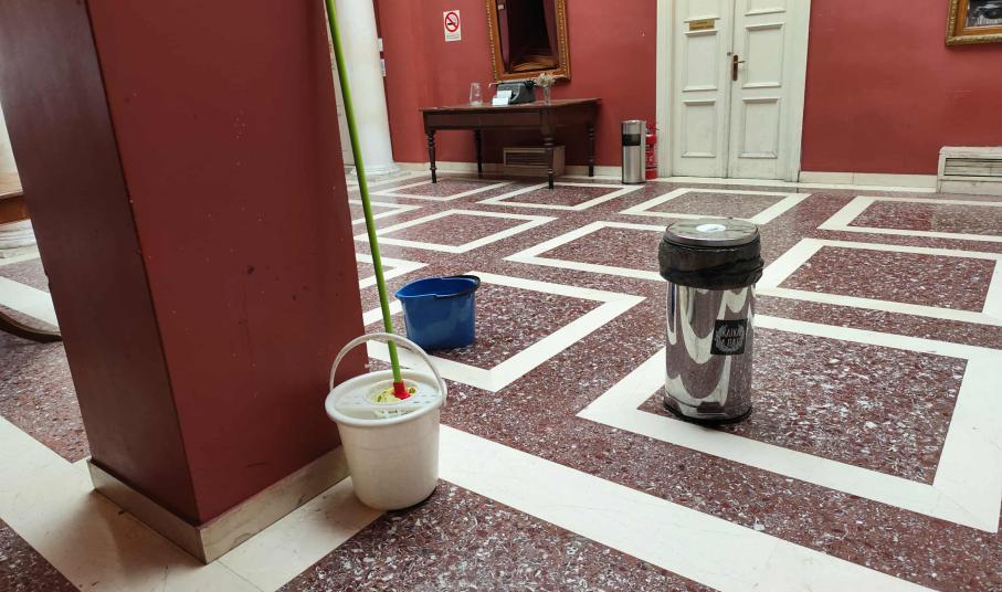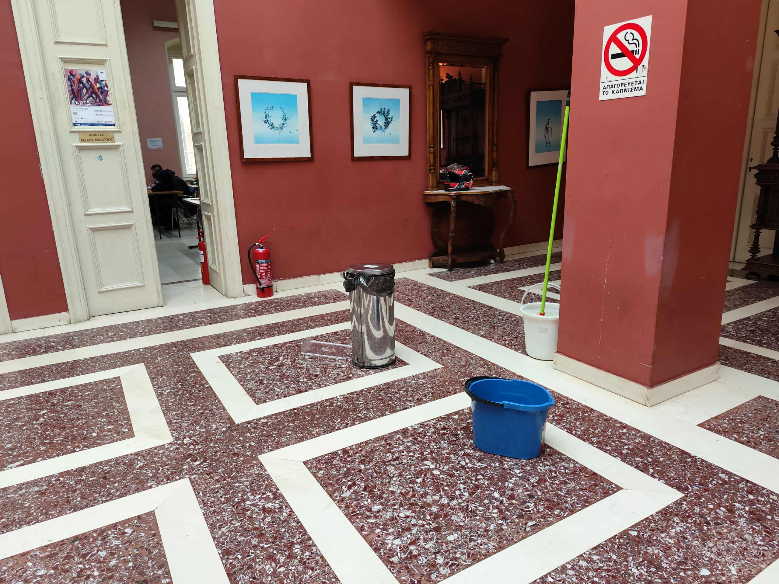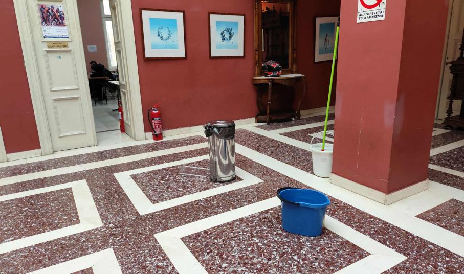 Με “δράμα” που επαναλαμβάνεται κάθε χειμώνα μοιάζει τα τελευταία χρόνια η κατάσταση που επικρατεί στο πολύπαθο Πνευματικό Κέντρο Ερμούπολης, τις βροχερές ημέρες, καθώς το νερό εισρέει στο εσωτερικό του, με ό,τι αυτό συνεπάγεται για την περαιτέρω υποβάθμιση και φθορά του ιστορικού κτηρίου.