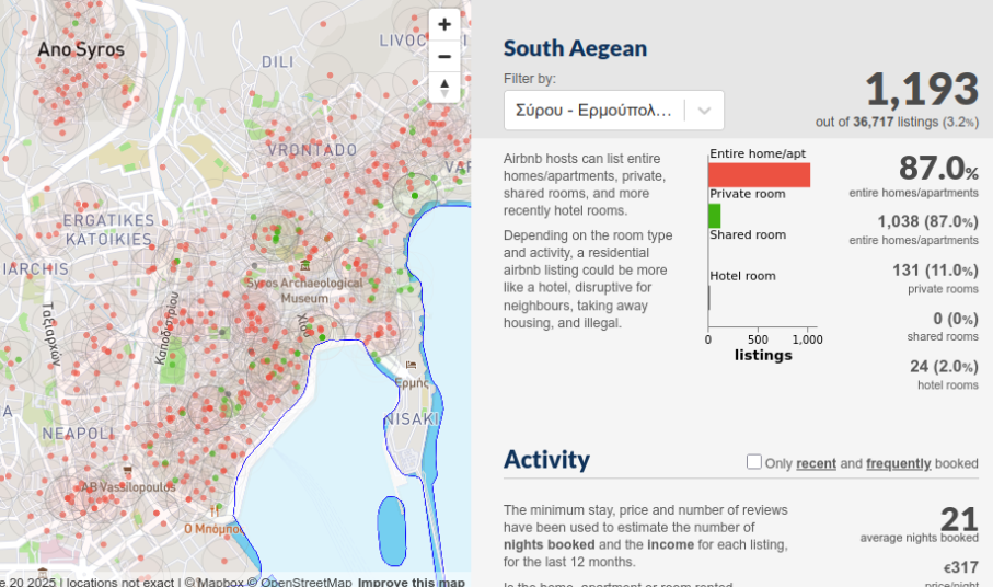 Την ίδια στιγμή σύμφωνα με τα στοιχεία της πλατφόρμας insideairbnb.com, 1038 κατοικίες στο νησί μας είναι δεσμευμένες για βραχυχρόνια μίσθωση, τη στιγμή που νοικιάζονται κατά μέσο όρο μόλις 21 μέρες το χρόνο. Αλλά ποια οικογένεια νέων εργαζομένων μπορεί να εγκαταλείπει την κατοικία της κάθε καλοκαίρι;