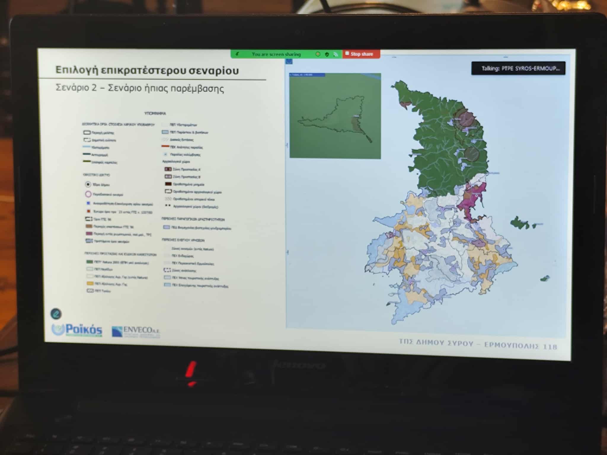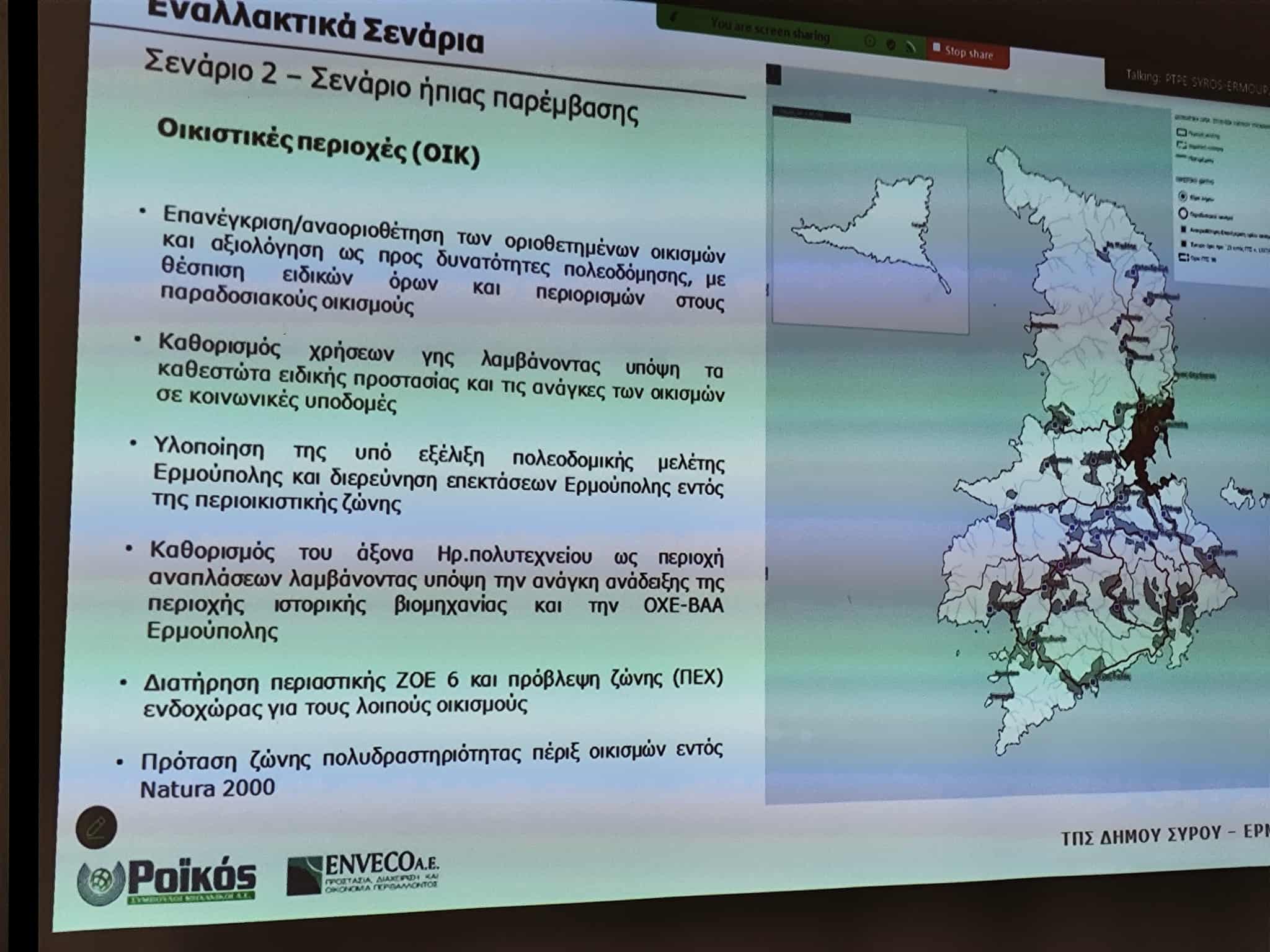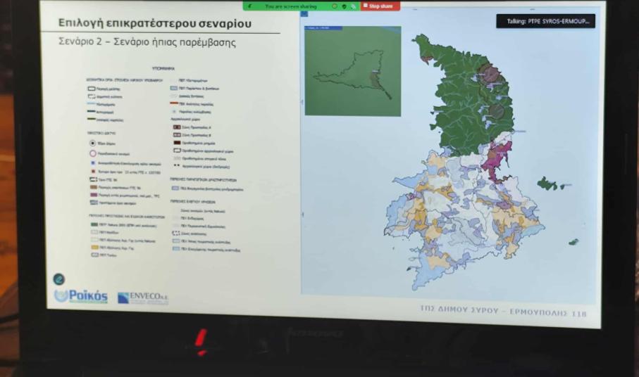 Επί της ουσίας, οι πολίτες καλούνται να δουν τα τρία σενάρια τοπικής ανάπτυξης της Σύρου στις λεπτομέρειές τους. Ειδικότερα και με βάση την παρουσίαση, το πρώτο σενάριο είναι το σενάριο μηδενικής παρέμβασης, στο οποίο αναδεικνύονται οι αναμενόμενες επιπτώσεις (συνήθως αρνητικές) για κάθε εξεταζόμενη θεματική ενότητα / τομέα. Το συγκεκριμένο σενάριο εκφράζει τη συνέχιση της υφιστάμενης κατάστασης στην περιοχή μελέτης, χωρίς την τοποθέτηση νέων πολεοδομικών “εργαλείων” και χωρίς επικαιροποίηση του σχεδιασμού με βάση τις νεότερες ανάγκες, τις κατευθύνσεις και τα υπερκείμενα επίπεδα.