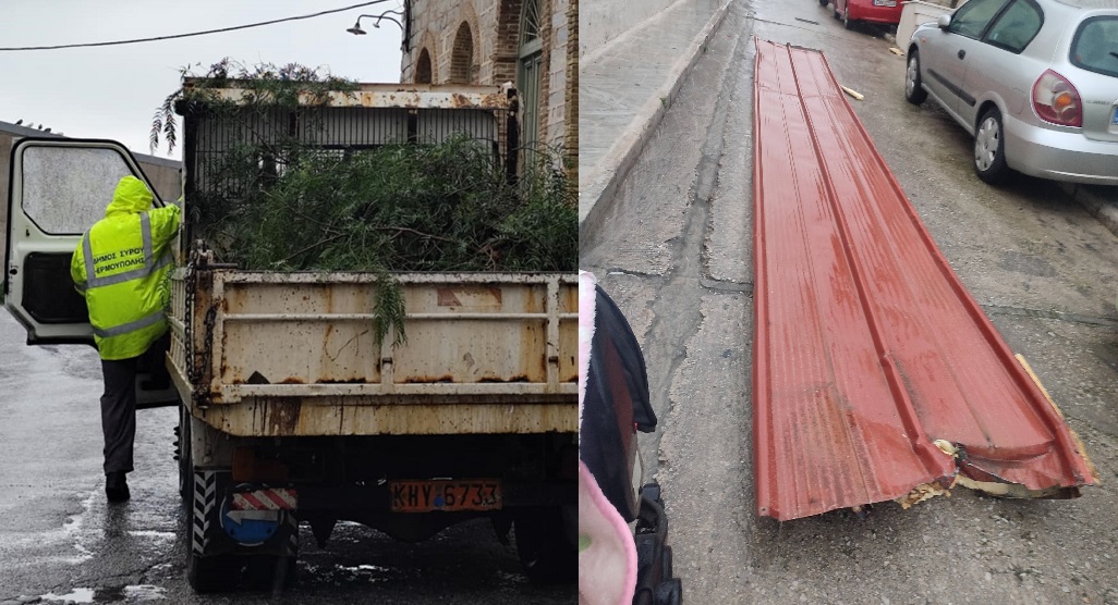 Συγκεκριμένα, στην περιοχή, καθαρά από τύχη δεν προκλήθηκε ατύχημα σε πεζούς ή οδηγούς, αφού η λαμαρίνα αρκετών μέτρων "προσγειώθηκε" στο οδόστρωμα. Σχετική ανάρτηση έκανε συμπολίτισσά μας στα μέσα κοινωνικής δικτύωσης , ενώ επιπλέον, καταστροφές προκλήθηκαν σε δέντρα απέναντι από το Νοσοκομείο Σύρου. Ειδικότερα, μεγάλα κλαδιά έπεσαν στα πεζοδρόμια με τα φορτηγάκια του Δήμου Σύρου - Ερμούπολης και την Πυροσβεστική να είναι επί ποδός για την απομάκρυνσή τους.