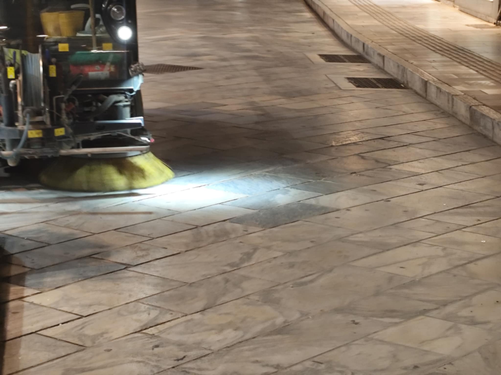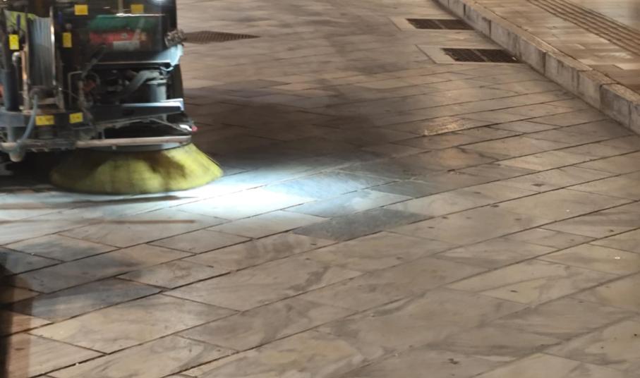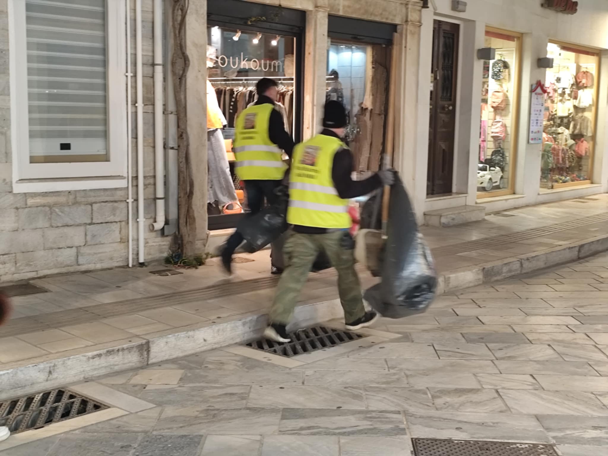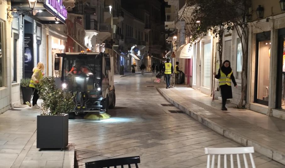 Σερπαντίνες μπλεγμένες στα πεζοδρόμια, χαρτοπόλεμος στις σχάρες των φρεατίων και διάσπαρτα σκουπίδια συγκεντρώθηκαν και απομακρύνθηκαν με συντονισμένες κινήσεις. Σκούπες, φυσητήρες και μηχανικά σάρωθρα ανέλαβαν δράση, ενώ οι εργαζόμενοι, μεθοδικά και αδιάκοπα, φρόντισαν κάθε σημείο του κέντρου.