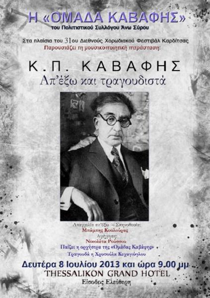Η «Ομάδα Καβάφης» του Π.Σ. Άνω Σύρου, παρουσίασε το αφιέρωμά της στον Αλεξανδρινό, στo πλαίσια του 31ου Διεθνούς Χορωδιακού Φεστιβάλ Καρδίτσας, το οποίο ήταν αφιερωμένο και στα 150 χρόνια από τη γέννηση του Κ. Καβάφη (1873 – 2013, έτος Καβάφη).