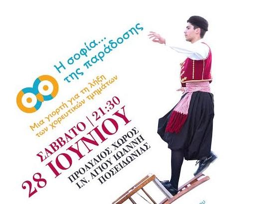 Το εργαστήρι παραδοσιακών χορών «η σοφία …της παράδοσης» διοργανώνει γιορτή με την ευκαιρία της λήξης των χορευτικών τμημάτων της χειμερινής περιόδου 2013-2014, το Σάββατο 28 Ιουνίου, στις 9.30 μ.μ., στο προαύλιο του Ι.Ν. Αγίου Ιωάννη Ποσειδωνίας.
