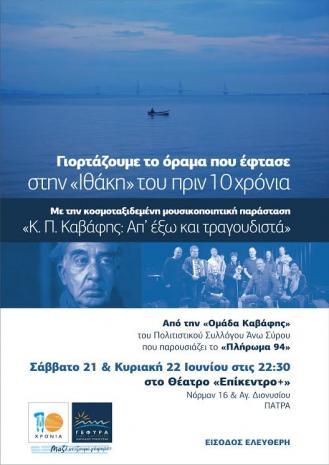 Στην Πάτρα, στη σκηνή του Επίκεντρο+ θα φιλοξενηθεί το Σάββατο 21 και την Κυριακή 22 Ιουνίου 2014 στις 22:30 η πολυταξιδεμένη μουσικοποιητική παράσταση της “Ομάδας Καβάφης” του Πολιτιστικού Συλλόγου Άνω Σύρου, “Κ.Π. Καβάφης: Απ' έξω και τραγουδιστά”.