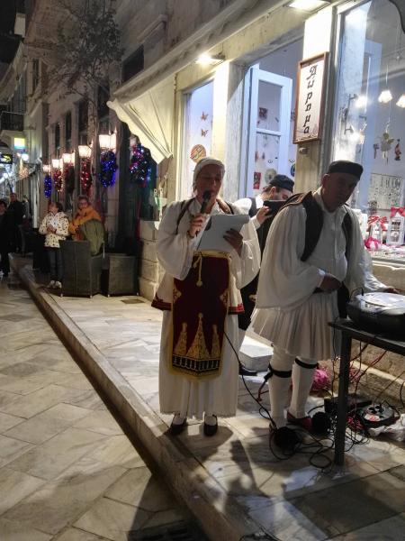 Παραδοσιακά κάλαντα, καθώς επίσης χορευτικές φιγούρες στους παραδοσιακούς ρυθμούς της καραγκούνας, του τσάμικου, αλλά ακόμη και του συρτού και του Ικαριώτικου μπάλου κόσμησαν την οδό Πρωτοπαπαδάκη, με τα μέλη του Συλλόγου, καθώς επίσης και του παραδοσιακού εργαστηρίου “Άρωμα Παράδοσης” να αποσπούν το θερμό χειροκρότημα των διερχόμενων πολιτών.