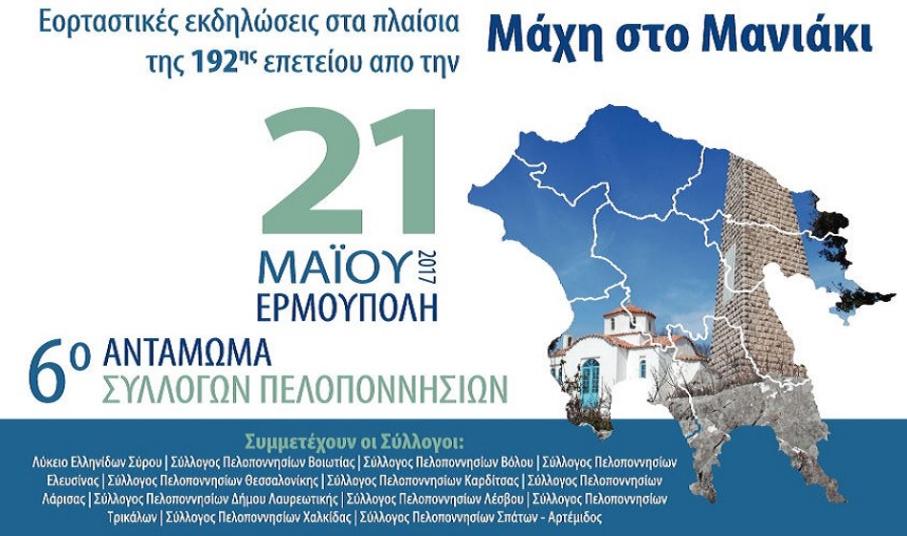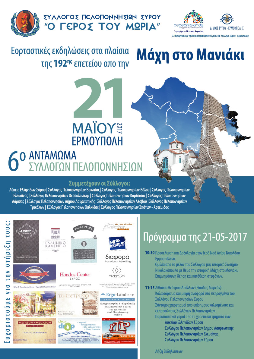 Ο Σύλλογος Πελοποννησίων Σύρου “Ο Γέρος του Μωριά”, σε συνδιοργάνωση με την Περιφέρεια Νοτίου Αιγαίου και τον Δήμο Σύρου – Ερμούπολης, πραγματοποιεί το 6ο Αντάμωμα Συλλόγων Πελοποννησίων στην Ερμούπολη, το διήμερο 20 – 21 Μαΐου 2017.