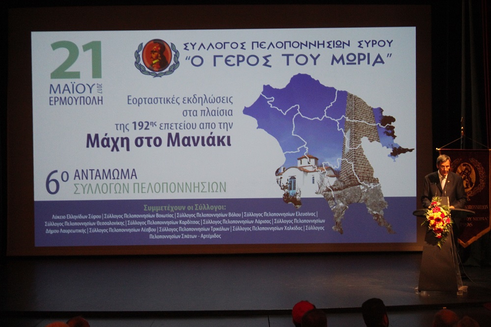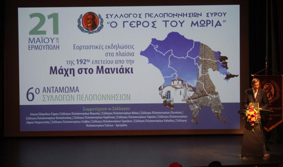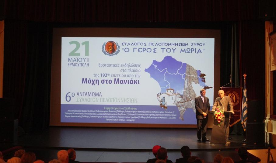 Στη Σύρο αντάμωσαν το προηγούμενο διήμερο εννέα Σύλλογοι Πελοποννησίων από όλη την Ελλάδα, προβάλλοντας τις παραδόσεις του τόπου τους, καθώς και τις αξίες της ενότητας και της ελευθερίας μέσα από τη συμμετοχή τους στον εορτασμό της 192ης επετείου από τη Μάχη στο Μανιάκι.