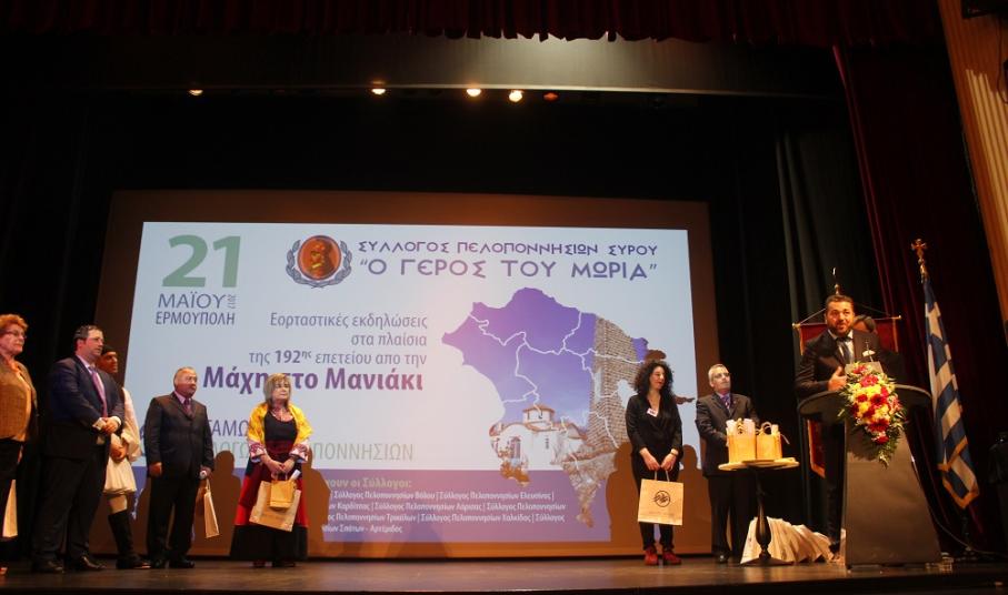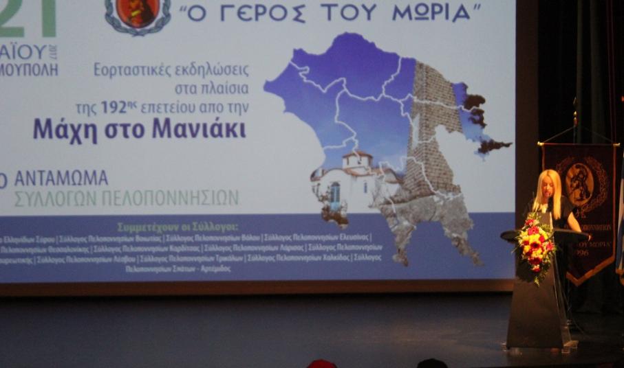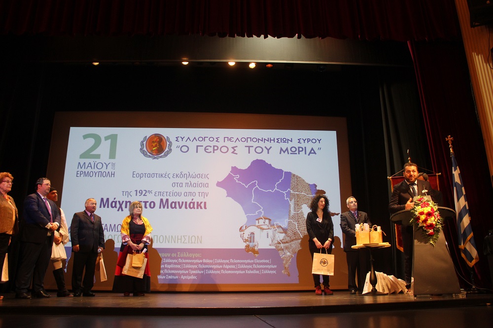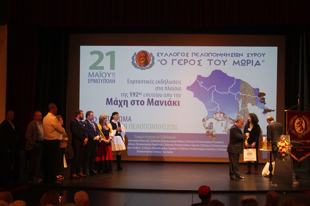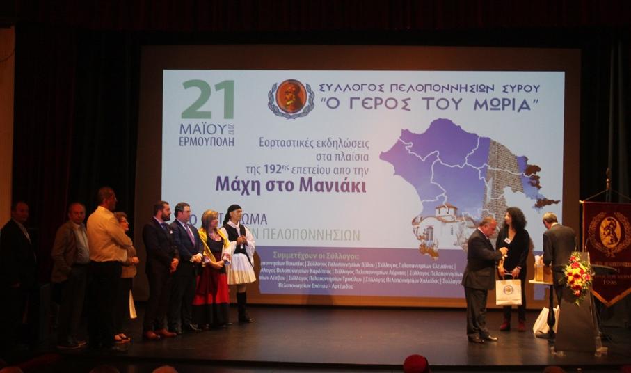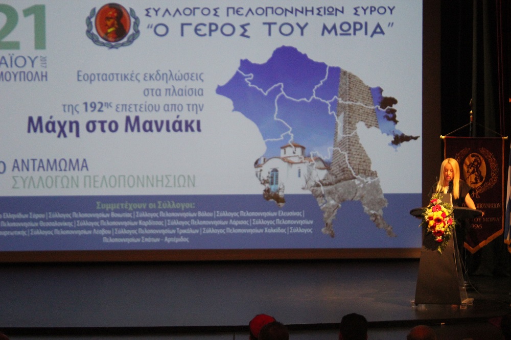 Εξίσου επαινετικός ήταν και ο λόγος της Αντιδημάρχου Πολιτισμού, Θωμαής Μενδρινού, η οποία τόνισε πως ο Σύλλογος Πελοποννησίων Σύρου αποτελεί υπόδειγμα συλλόγου που χαρακτηρίζεται από την ομαδικότητα, την υπερηφάνεια και τη δοτικότητα σε ό,τι κι αν κάνει. «Είναι πολύ σημαντικό να μένουμε πιστοί στις παραδόσεις και τις αξίες μας και να διατηρούμε άσβεστο το αίσθημα της ενότητας και αλληλεγγύης. Όπως στη Μάχη στο Μανιάκι ο λαός μας αγωνίστηκε γενναία και με σθένος την πολυπόθητη ελευθερία, έτσι κι εμείς να μην ξεχνάμε ότι η ενότητα και η ομοψυχία θα μας οδηγήσουν για μία ακόμη φορά στο φως και στην ελπίδα» ανέφερε χαρακτηριστικά, συγχαίροντας όλους τους συμμετέχοντες για το έργο τους, μέσω του οποίου δυναμώνουν και αναδεικνύουν την πολιτιστική μας κληρονομιά.