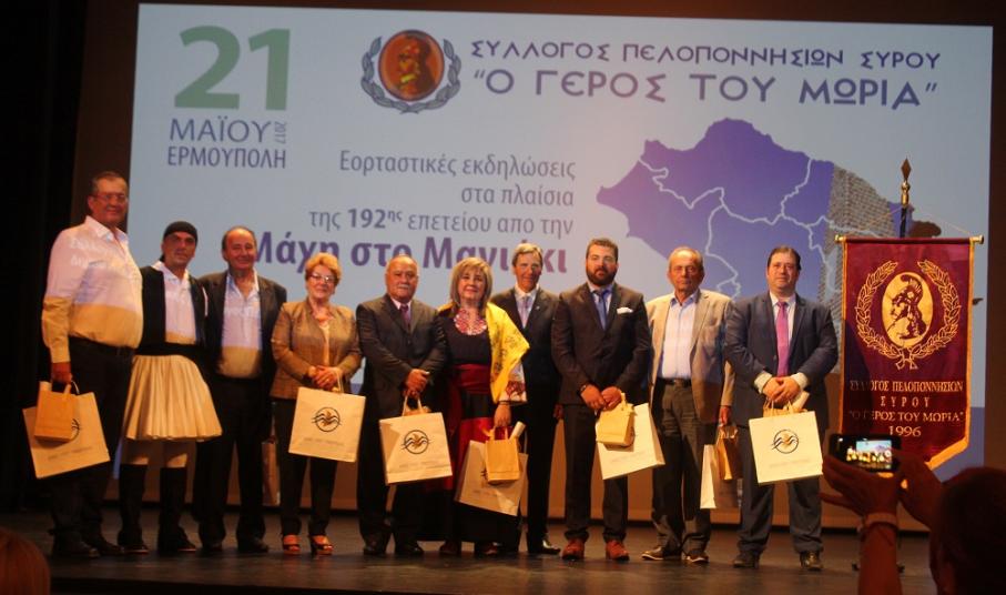 Στη συνέχεια απονεμήθηκαν αναμνηστικά δώρα στους προέδρους των Συλλόγων από τον Σύλλογο Πελοποννησίων Σύρου και τον Δήμο Σύρου – Ερμούπολης, ενώ η εκδήλωση ολοκληρώθηκε με παραδοσιακούς χορούς από τα χορευτικά τμήματα του Λυκείου Ελληνίδων Σύρου, του Συλλόγου Πελοποννησίων Δήμου Λαυρεωτικής, του Συλλόγου Πελοποννησίων Ελευσίνας και Συλλόγου Πελοποννησίων Σύρου.