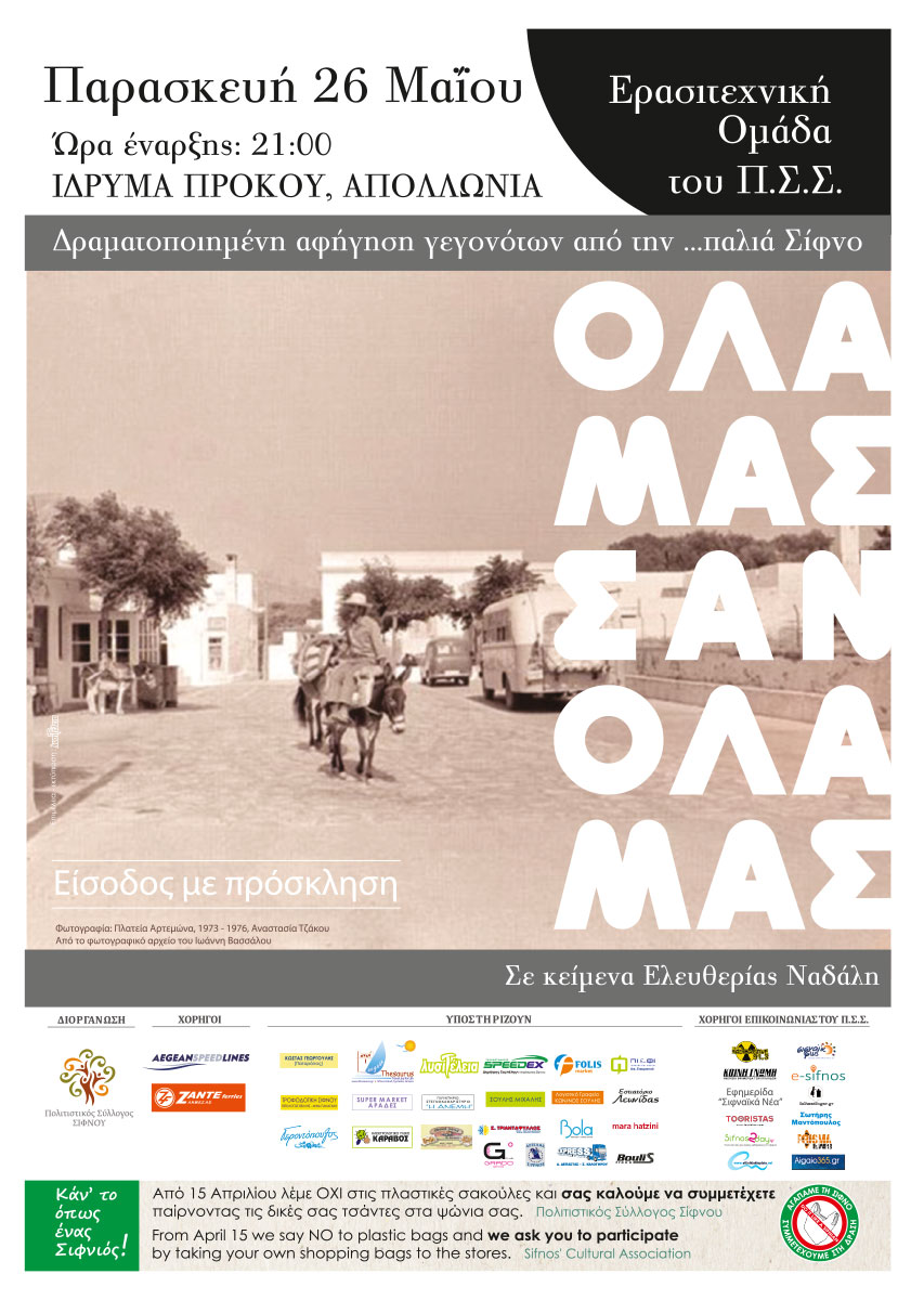Τη δραματοποιημένη αφήγηση γεγονότων από την ...παλιά Σίφνο, "Όλα μας... σαν όλα μας", σε κείμενα της Ελευθερίας Ναδάλη παρουσιάζει η ερασιτεχνική ομάδα του Πολιτιστικού Συλλόγου Σίφνου την Παρασκευή 26 Μαίου 2017, στο Ίδρυμα Πρόκου στην Απολλωνία.