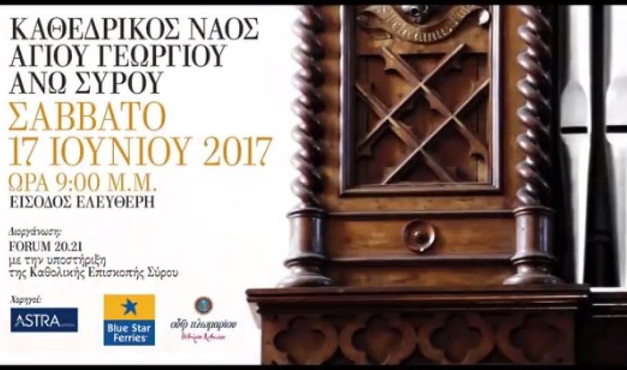 Με μία ξεχωριστή συναυλία στην οποία θα “πρωταγωνιστούν” οι ήχοι εκκλησιαστικού οργάνου και πνευστών μουσικών οργάνων στον Καθεδρικό Ναό του Αγίου Γεωργίου στην Άνω Σύρο επέλεξε το FORUM 20.21 να κλείσει την “αυλαία” της διαδρομής του, αφού εκλείπει πλέον, ο κύριος σκοπός της σύστασής του, που αφορούσε στη διεκδίκηση του τίτλου της Πολιτιστικής Πρωτεύουσας της Ευρώπης για το έτος 2021.
