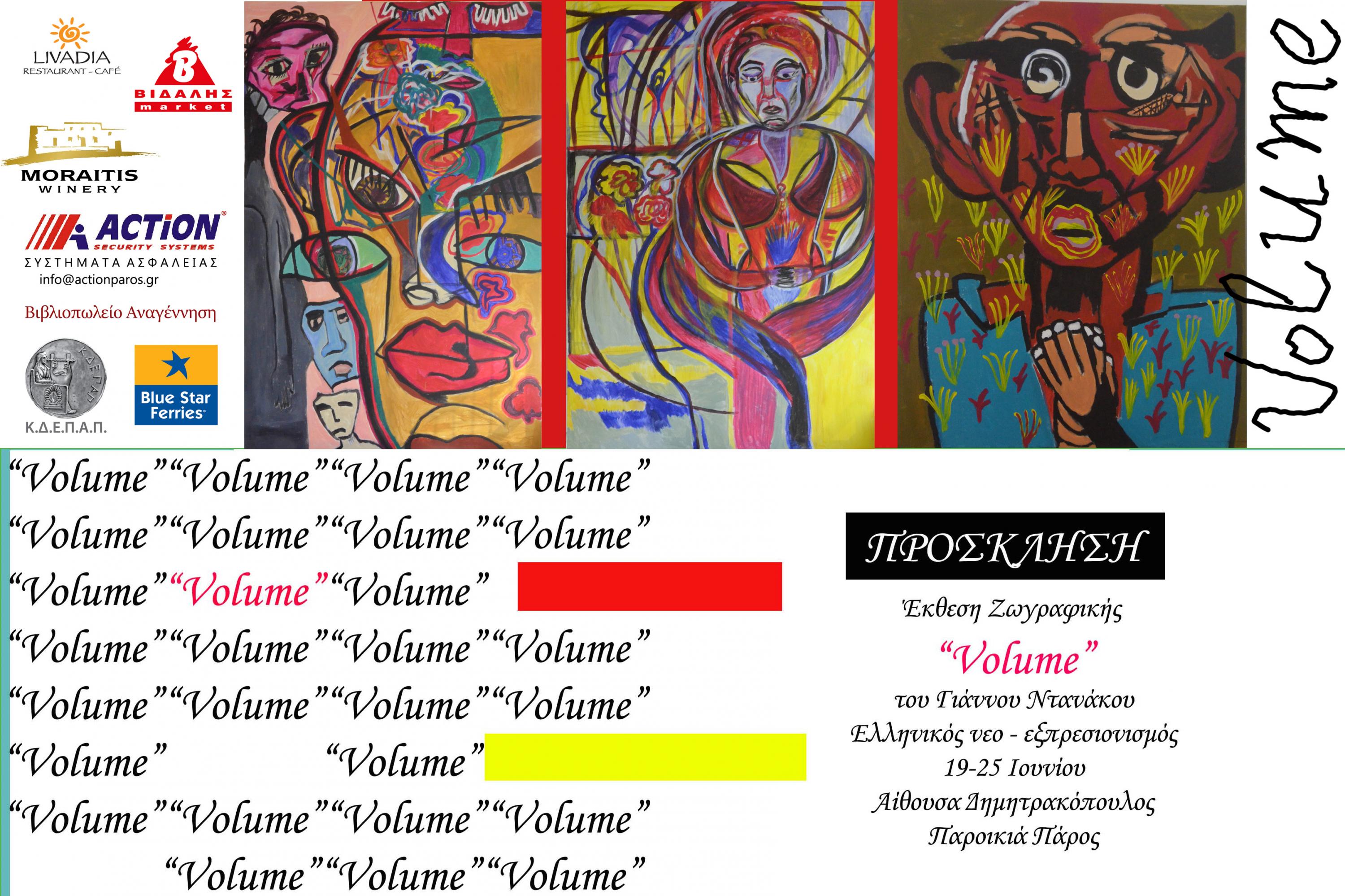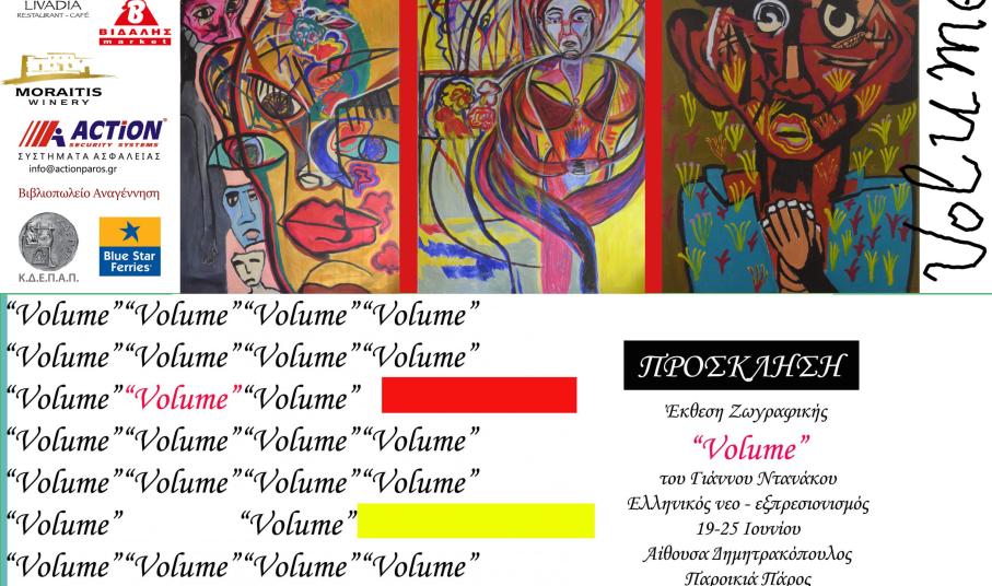 Έχουμε την χαρά να σας προσκαλέσουμε στην έκθεση Ζωγραφικής "Volume" του καλλιτέχνη Γιάννου Ντανάκου στην Αίθουσα Δημητρακόπουλος του Δήμου Πάρου την Δευτέρα 19 Ιουνίου στις 20:00.