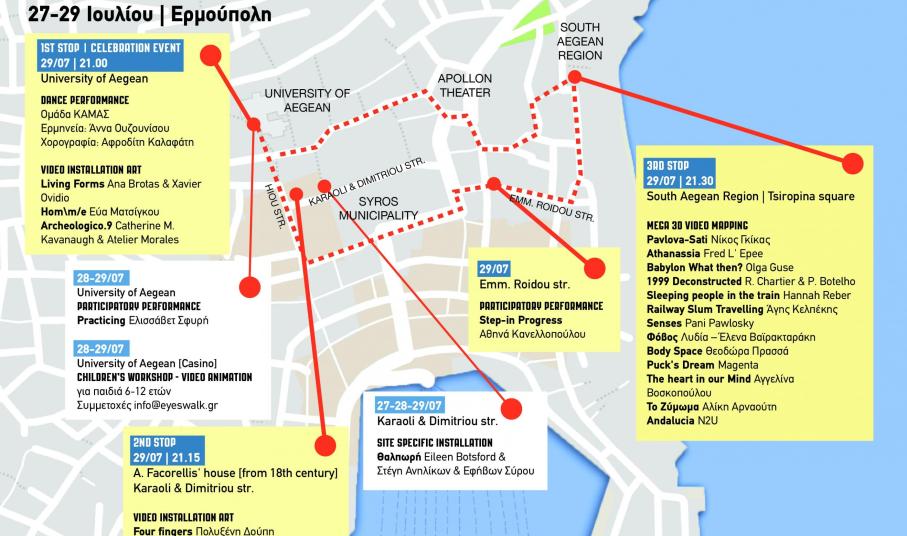 Παιδικό workshop  για παιδιά 6-12 ετών με θέμα το video mapping & τo animation θα πραγματοποιηθεί στις 28 & 29 Ιουλίου από την public artist Αθηνά Κανελλοπούλου. Οι μικροί πολίτες θα αποκτήσουν την πρώτη τους εμπειρία με την τέχνη και την αρχιτεκτονική του δημόσιου χώρου καθώς το  animation που θα δημιουργηθεί θα προβληθεί επάνω σε ιστορικό κτήριο της Ερμούπολης. Δηλώσεις συμμετοχών στο info@eyeswalk.gr.