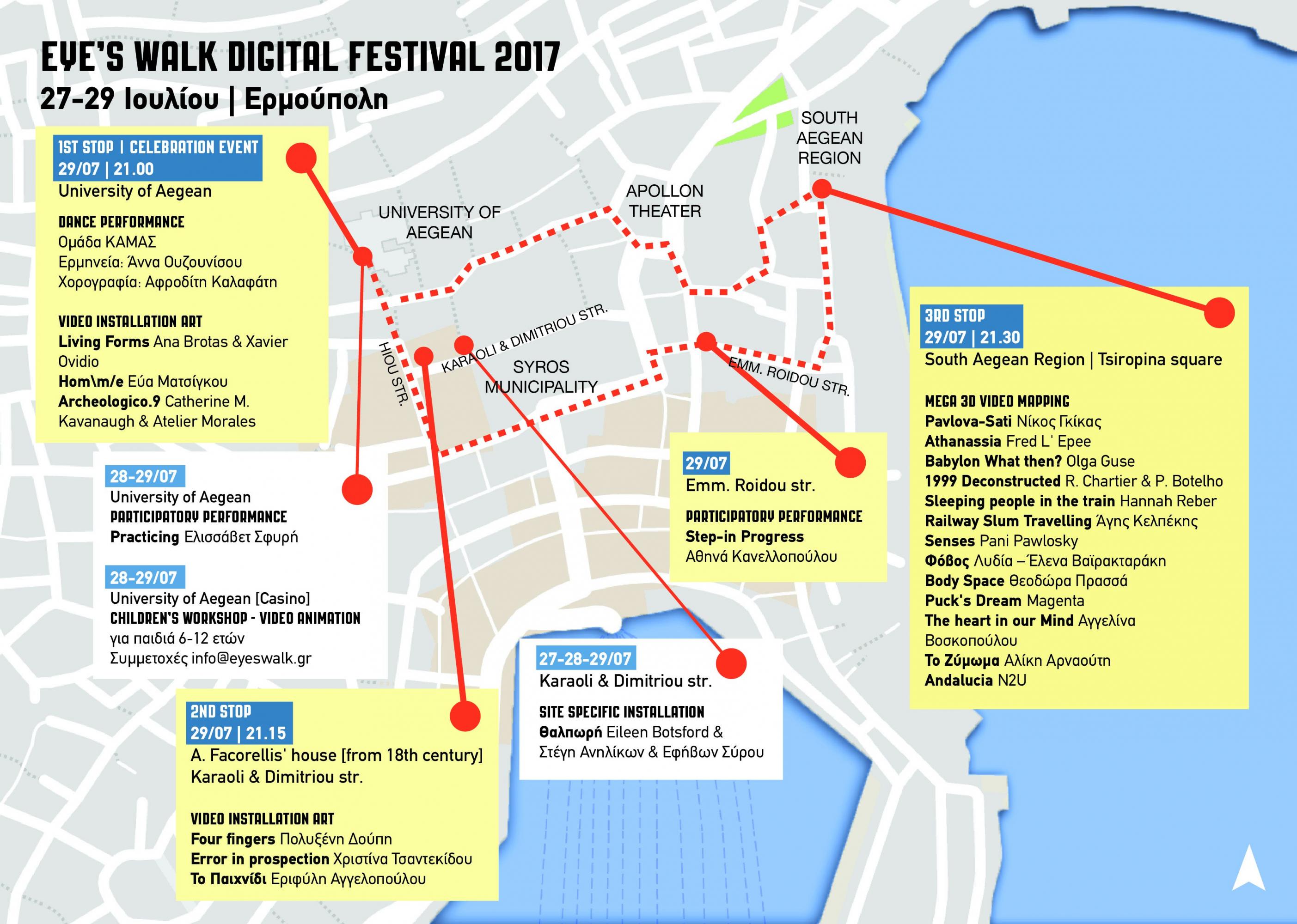 Curator του Eye’s Walk Digital Festival είναι η Φιλία Μηλιδάκη και Multimedia Specialist ο Σπύρος Κουδουνάς. Με τη συνδιοργάνωση του Δήμου Σύρου –Ερμούπολης και της Περιφέρειας Ν. Αιγαίου.