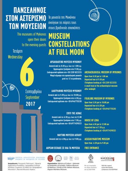 Το Αρχαιολογικό Μουσείο Μυκόνου στις 6 Σεπτεμβρίου θα βρίσκεται ανοικτό και επισκέψιμο από τις 8:30 μ.μ. έως τις 1:00 π.μ., ενώ θα πραγματοποιηθεί οργανωμένη ξενάγηση στις 9:30 μ.μ. (τηλεφωνική κράτηση στο +30 2289 022325), καθώς και μικρό κέρασμα στο αρχαιολογικό μουσείο μετά τις 12 τα μεσάνυχτα.