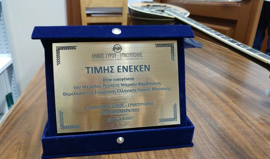 Στην έναρξη της συναυλίας, ο Δήμος Σύρου – Ερμούπολης απένειμε στον Στέλιο Βαμβακάρη Τιμητική Πλακέτα, ως ελάχιστη αναγνώριση του έργου του αλησμόνητου Μάρκου, ο οποίος εξύψωσε το νησί μας, το ύμνησε μέσα από τα τραγούδια του και το συνέδεσε με μια μεγάλη παράδοση, αυτή του σύγχρονου λαϊκού τραγουδιού. Με την εμφάνιση και τη βράβευση του Στέλιου, ένα κομμάτι της Σύρου αποκαταστάθηκε και επέστρεψε στη θέση που του αρμόζει, μετά από δεκαετίες ολόκληρες που το όνομα και η μουσική του Μάρκου και των άλλων συνθετών του Ρεμπέτικου, παρέμεναν στα συρτάρια της πολιτιστικής ζωής της Σύρου.