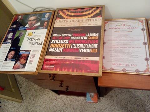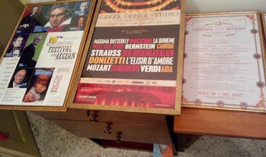 Ειδικότερα, στην κατοχή του Θεάτρου βρίσκονται τα κάδρα από: 10 Διεθνές Φεστιβάλ Αιγαίου – Πρόγραμμα, 8ο Διεθνές Φεστιβάλ Αιγαίου, Διεθνές Φεστιβάλ Αιγαίου 11-22 Ιουλίου 2007, ΙΧ-International Festival of the Aegean 2013, Συναυλία κάτω από τ’ αστέρια, Σαλώμη – 8ο Διεθνές Φεστιβάλ Αιγαίου, 13ο Διεθνές Φεστιβάλ Αιγαίου – Οι καλύτερες στιγμές, 13ο Διεθνές Φεστιβάλ Αιγαίου – 18 Ιουλίου Τσαϊκόφσκι, Ντβόρζακ, Μπραμς, 13ο Διεθνές Φεστιβάλ Αιγαίου – Μαντάμα Μπατερφλάι, 12ο Διεθνές Φεστιβάλ Αιγαίου με υπογραφές, 13ο Διεθνές Φεστιβάλ Αιγαίου – Μαντάμα Μπατερφλάι με υπογραφή, Pan- European Philarmonia – Peter Tiboris, 8ο Διεθνές Φεστιβάλ Αιγαίου – Greek Opera Studio και 8ο Διεθνές Φεστιβάλ Αιγαίου.