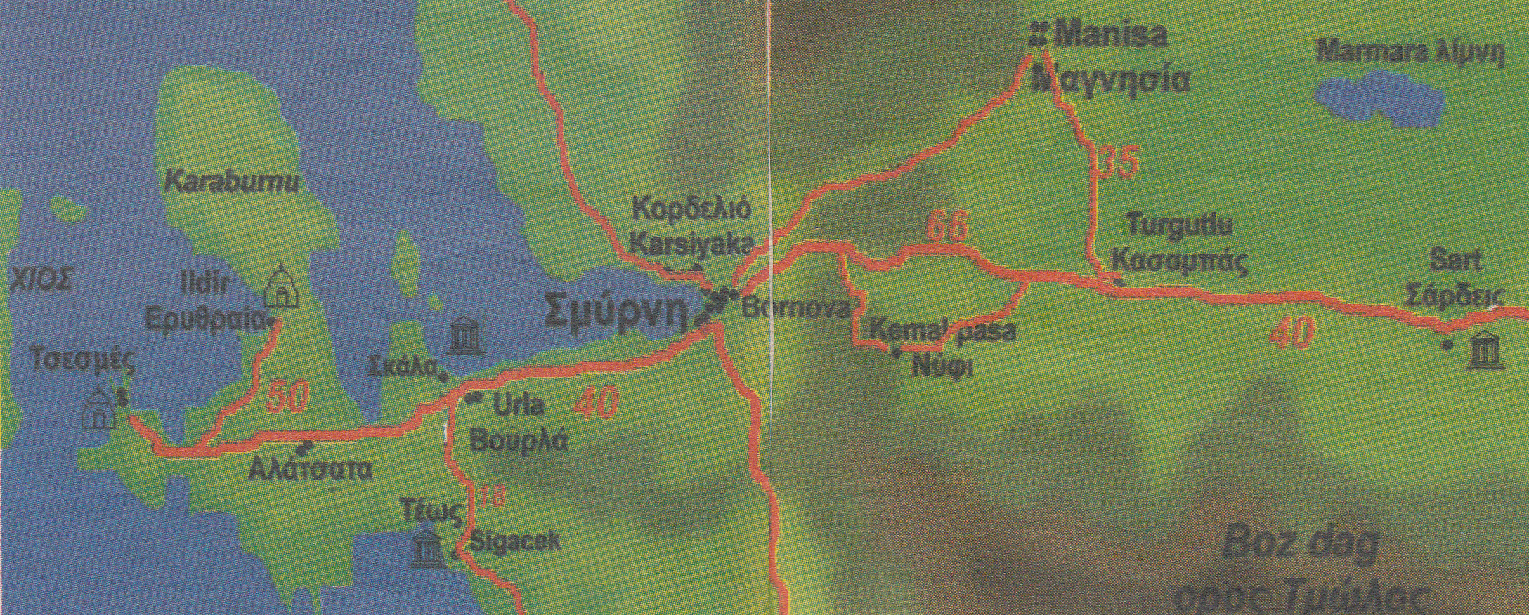 Το ελληνικό όνομα αυτής της μικρής πόλης ήταν Κρήνη. Ο Τσεσμές, το Ιλντιρ, τα Βουρλά κ.α. μικρές πολιτειούλες ή χωριά είναι στη χερσόνησο της Ερυθραίας που βρίσκεται ακριβώς απέναντι από τη Χίο. Ο Τσεσμές ήταν μια έρημη μικρή πολιτειούλα και τώρα έγινε μαι τουριστική πόλη. Υπάρχει ακόμη στο λόφο το μεγάλο κάστρο που επιτηρεί ακόμη το λιμάνι απέναντι από τη Χίο. Υπάρχει ακόμη η παλιά πλατεία με τη μεγάλη εκκλησία του Αγίου Χαραλάμπους που κάποτε, στη δεκαετία του '60, είχε χρησιμοποιηθεί ως εργοστάσιο παραγωγής ηλεκτρικού ρεύματος. Τώρα έχουν αλλάξει κάπως τα πράγματα. Έγιναν αρκετές εργασίες ανακαίνισης και ο ναός χρησιμοποιείται ως αίθουσα εκθέσεων. Το βαθύ γαλάζιο των τοιχογραφιών παραμένει ακόμη ζωηρό. Οι εικόνες όμως δεν υπάρχουν. Ο Τσεσμές, η Κρήνη, όπως ονομαζόταν παλαιότερα, είχε 15.000 κατοίκους και υπήρχαν πολύ σπουδαία εκπαιδευτήρια. Υπήρχε η “Κρηναία Σχολή Αρρένων” και αντίστοιχη Θηλέων. Σήμερα είναι ένα τουριστικό χωριό.