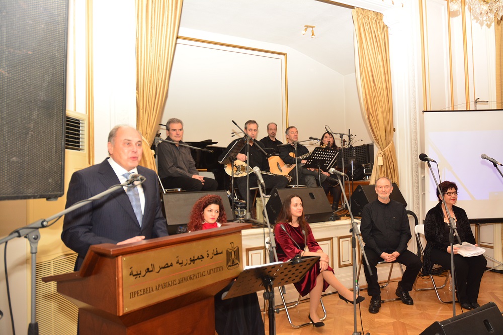 Για άλλη μια φορά η  ‘’Ομάδα Καβάφης’’  γοήτευσε  τους θεατές οι οποίοι παραβρέθηκαν το Σάββατο 10 Φεβρουαρίου 2018 στο νεοκλασικό αριστούργημα του Ερνέστου Τσίλερ στην οδό Βασιλ. Σοφίας 3,  απέναντι από τη Βουλή των Ελλήνων, όπου στεγάζεται η Πρεσβεία, για να παρακολουθήσουν το μουσικοποιητικό αφιέρωμα της Ομάδας στον Αλεξανδρινό με τον τίτλο ‘’Κ.Π. Καβάφης – απέξω και τραγουδιστά’’.  Την Ομάδα προσκάλεσε επίσημα ο εξοχότατος πρέσβης της Αραβικής Δημοκρατίας της Αιγύπτου κ. Farid Monib.  Έτσι οι Συριανοί καλλιτέχνες μετά το Κίνι και το Θέατρο Απόλλων της Σύρου, το Μέγαρο Μουσικής Αθηνών, Θεσσαλονίκης και Manuel de Falla της Γρανάδας, τα Πανεπιστήμια Χάρβαρντ και Ελσίνκι, τη Ρωμαϊκή Αγορά της Αθήνας, το Ίδρυμα Ευγενίδου, Μύκονο, Πάτρα, Καβάλα, Αμοργό, το Παλάτι των Ιπποτών της Ρόδου, Δήλο και Δελφούς, την Αλεξάνδρεια, Κωνσταντινούπολη, Βοστώνη, Νέα Υόρκη, Παρίσι, Βρυξέλλες, Στοκχόλμη, Σύδνεϋ, Αδελαΐδα και 50 άλλες πόλεις, γιόρτασαν τη 12χρονη πορεία τους στην Πρεσβεία της φίλης χώρας της Αιγύπτου, πολίτης της οποίας υπήρξε και  ο Κωνσταντίνος Καβάφης. Η παράσταση πραγματοποιήθηκε στη θαυμάσια αίθουσα εκδηλώσεων της πρεσβείας αφού προηγήθηκε μια πολύ όμορφη δεξίωση με  Αιγυπτιακά εδέσματα. Τους προσκεκλήμένους  χαιρέτισε ο οικοδεσπότης Αιγύπτιος πρέσβης ενώ την Ομάδα παρουσίασε με πολύ επαινετικά λόγια ο πλαστικός χειρουργός, φίλος της Ομάδας,  Δρ Γιάννης Λύρας,  επίτιμος πρόξενος της Βραζιλίας στον Πειραιά, μέλος του Δ.Σ. της Επιστημονικής Εταιρείας Πλαστικών  Χειρουργών Ελλάδας.  Οι θεατές χειροκρότησαν με ενθουσιασμό τα τραγούδια, τις αφηγήσεις  και τις απαγγελίες και η βραδιά τελείωσε μέσα σε ένα κλίμα βαθιάς συγκίνησης και χαράς ενώ προσφέρθηκαν στα μέλη της Ομάδας πολύ όμορφες ανθοδέσμες. Παραβρέθηκαν ο Διευθυντής του Υπουργείου Εξωτερικών πρέσβης κ. Φραγκίσκος Βέρρος, ο κ. Κώστας Μεϊμάρης, Διευθυντής του Πολιτικού Γραφείου του Υφυπουργού κ. Τέρενς Κουίκ, η Αιγυπτιώτισσα, μεγάλη Αρχόντισσα του Πατριαρχείου Αλεξανδρείας, επιστήμων και επιχειρηματίας της Sofmedica Group in Romania κ. Αικατερίνη Σοφιανού-Μπελεφάντη,   ο κ. Κώστας Μιχαηλίδης Πρόεδρος του Συνδέσμου Αιγυπτιωτών Ελλήνων και πολλά μέλη του Δ.Σ. και του Συνδέσμου, ο κ. Γεώργιος Οικονομίδης, Πρόεδρος των Άστυ Αιγυπτιωτών της Κηφισιάς, ο κ. Ανδρέας Ζαΐμης Πρόεδρος των Φίλων της Βιβλιοθήκης Αλεξανδρείας, ο κ. Σπυρίδων Καμαλάκης Πρόεδρος του Συνδέσμου Ελληνο-Αιγυπτιακής φιλίας και Αντιπρόεδρος των Φίλων Βιβλιοθήκης Αλεξανδρείας, μέλη από το Ναυτικό Όμιλο Αιγυπτιωτών, ο υπεύθυνος marketing της Blue Star Ferries κ. Γιώργος Σακέλλης με τη σύζυγό του κ. Δαμανάκη,  ο διάσημος πλαστικός χειρουργός Δρ Γιάννης Λύρας με τη σύζυγό του, γνωστή ενδοκρινολόγο Δρ Παρή  Ράπτη,  ο Κυβερνήτης AHEPA HELLAS Νότιας Αθήνας και σύμβουλος του Πατριαρχείου Κωνσταντινουπόλεως κ. Παναγιώτης Ριζόπουλος, ο επίτιμος πρόξενος της DOMINICA και μέλος του Δ.Σ. του Προξενικού Σώματος Ελλάδας δικηγόρος κ. Χρήστος Βαρδίκος, ο τ. Γενικός Επιθεωρητής Δημόσιας Διοίκησης κ. Λέανδρος Ρακιντζής, η Διευθύντρια του Ινστιτούτου Κυβέλη κ. Βαλεντίνη Ποταμιάνου,  η Διευθύντρια της Λυρικής Σκηνής και του Animasyros κ. Μαρία Ανεστοπούλου, ο γνωστός επιχειρηματίας Ξενοδοχείων, άνθρωπος του πολιτισμού και της παράδοσης κ. Χρήστος Πρασσάκης, το ζεύγος Μάνου και Ντίνας Συκουτρή – Ανδριωμένου της γνωστής βιοτεχνίας λουκουμιών Σύρου Συκουτρή κ.α. Η παράσταση αυτή έ
