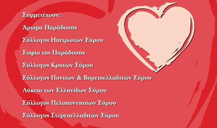 Για καλό σκοπό ενώνουν τις δυνάμεις τους χορευτικά τμήματα Συλλόγων της Σύρου, κατόπιν πρόσκλησης του Δήμου Σύρου – Ερμούπολης για τη συμμετοχή τους σε εκδήλωση φιλανθρωπικού χαρακτήρα, το Σάββατο 3 Μαρτίου 2018, στο Θέατρο Απόλλων.