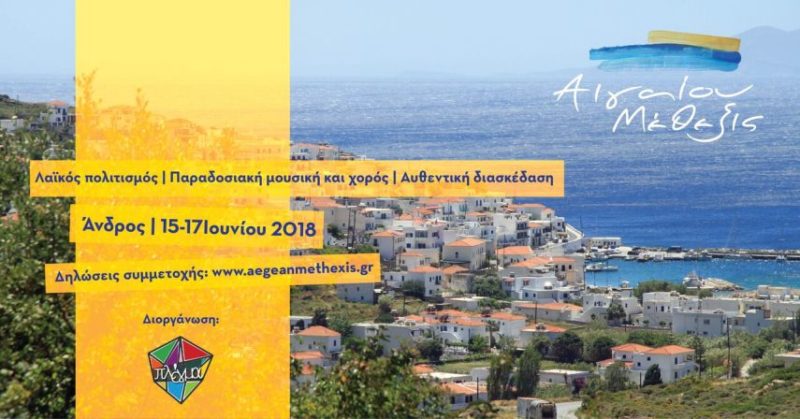 Λόγω αυξημένου ενδιαφέροντος, παρατείνεται έως τις 31 Μαΐου 2018 η προθεσμία δήλωσης συμμετοχών στο βιωματικό φεστιβάλ «Αιγαίου Μέθεξις», που τελεί υπό την αιγίδα του Δήμου Άνδρου.