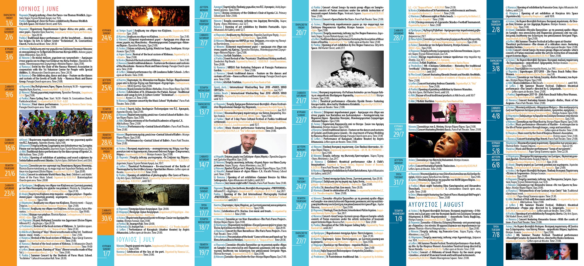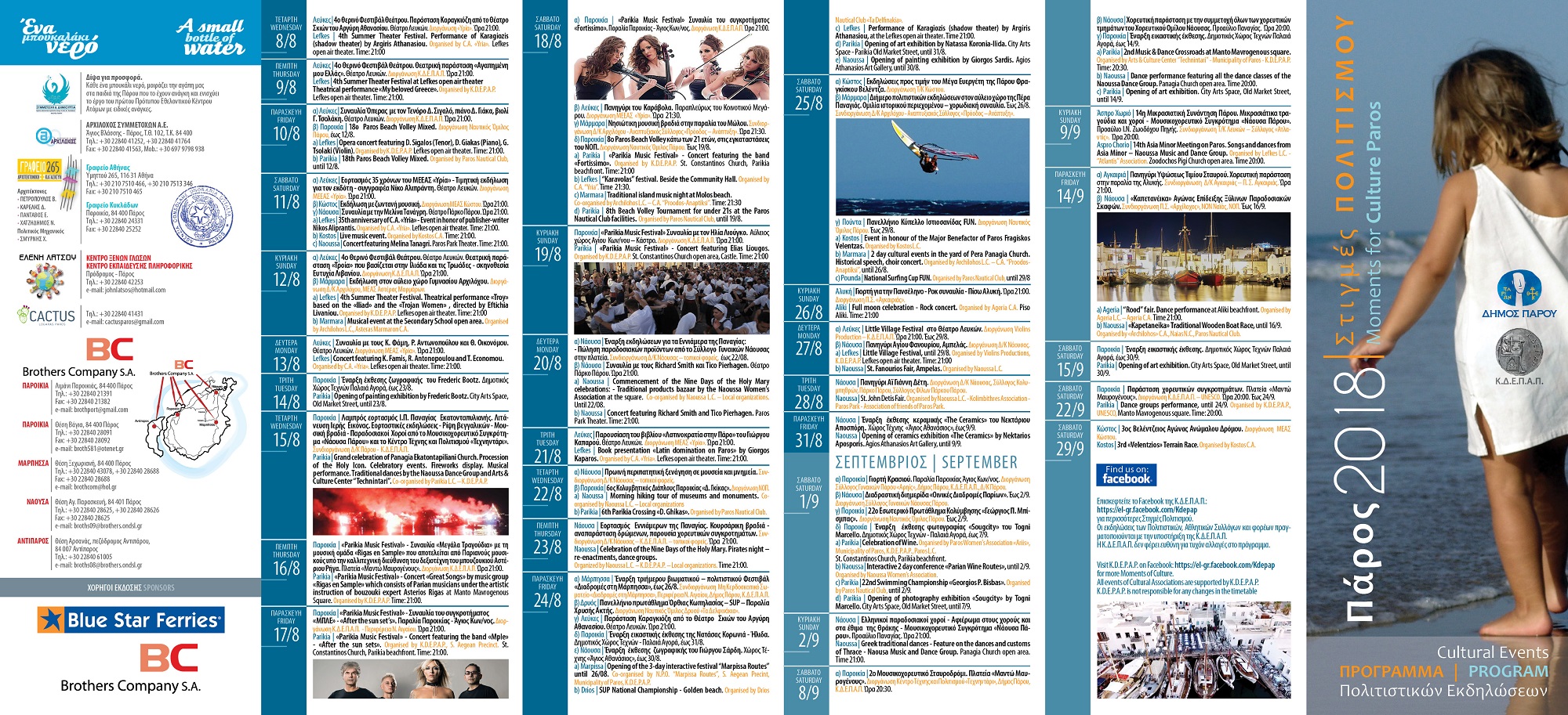 Θεατρικές παραστάσεις όπως "Τα ραδίκια ανάποδα" με τον Γιώργο Γαλίτη και "Η Σονάτα του Σεληνόφωτος" σε σκηνοθεσία Μάριου Ιορδάνου και η μουσικοθεατρική παράσταση του Γιάννη Ζουγανέλη, συναυλίες καταξιωμένων ερμηνευτών όπως ο Δημήτρης Μπάσης, ο Παντελής Θαλασσινός και η Ρίτα Αντωνοπούλου, εικαστικές εκθέσεις και παραδοσιακές βραδιές περιλαμβάνονται στο πολιτιστικό πρόγραμμα του Δήμου Πάρου και της ΚΔΕΠΑΠ με τίτλο "Στιγμές Πολιτισμού 2018".