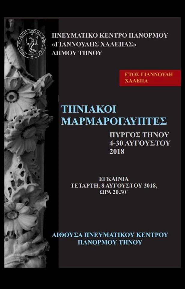 Το Πνευματικό Κέντρο Πανόρμου Γιαννούλης Χαλεπάς του Δήμου Τήνου με χαρά και ικανοποίηση χαιρετίζει τη συμμετοχή 24 καλλιτεχνών, μαρμαρογλυπτών στο ΕΤΟΣ ΧΑΛΕΠΑ παρουσιάζοντας το δημιουργικό τους έργο, εμπνευσμένο από τη ζωή και το έργο του μύστη της γλυπτικής τέχνης Γιαννούλη Χαλεπά, στο Πνευματικό Κέντρο Πανόρμου στον Πύργο, στο διάστημα 4-30 Αυγούστου 2018.