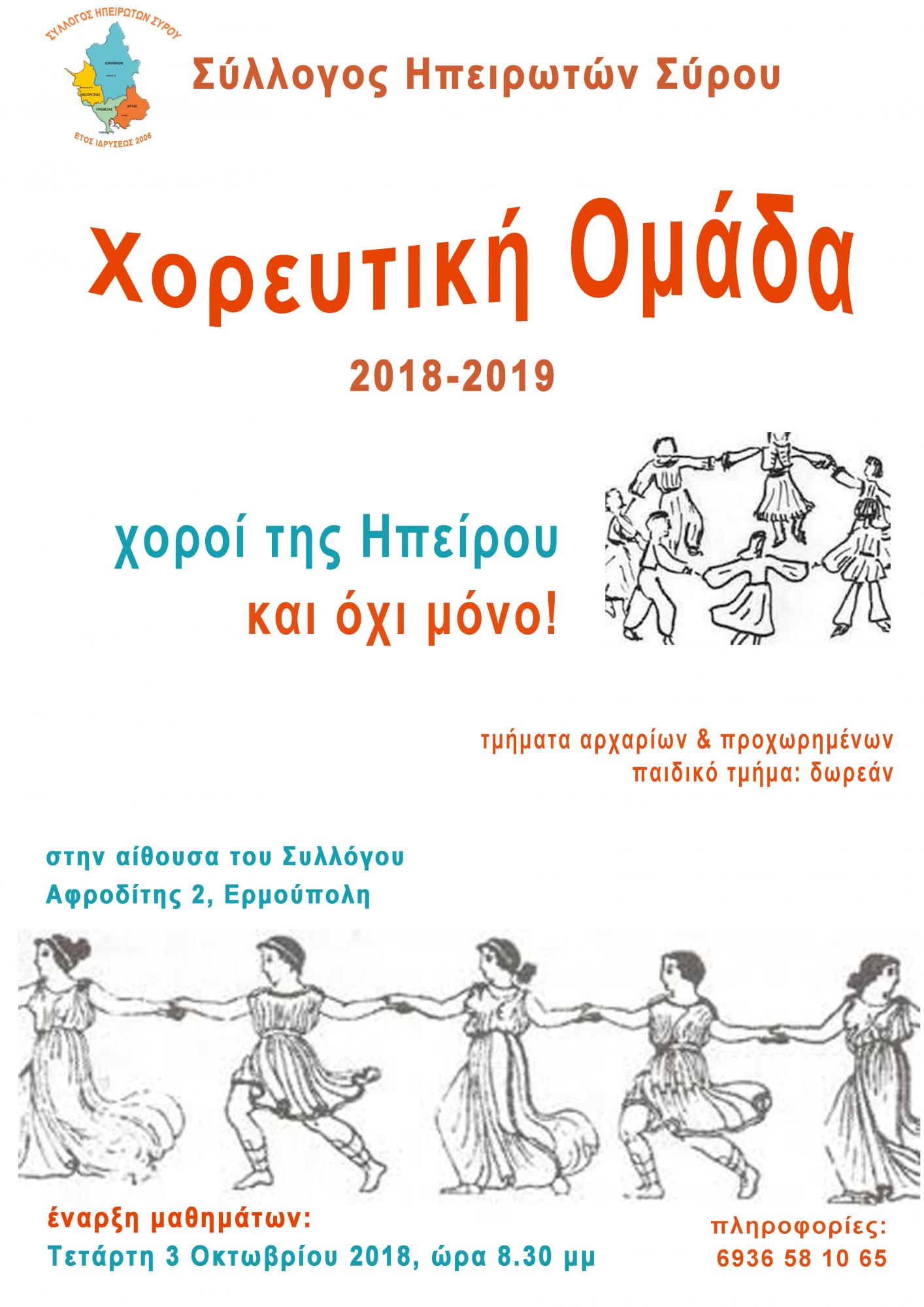 Ο κύκλος μαθημάτων της Χορευτικής Ομάδας του Συλλόγου Ηπειρωτών Σύρου για την περίοδο 2018-2019 ξεκινάει την Τετάρτη 3 Οκτωβρίου 2018 και ώρα 20:30, στην αίθουσα του Συλλόγου (Αφροδίτης 2, Ερμούπολη).