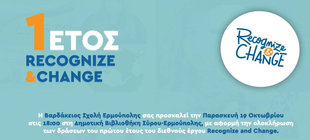Η Βαρδάκειος Σχολή Ερμούπολης σας προσκαλεί την Παρασκευή 19 Οκτωβρίου στις 18:00 στη Δημοτική Βιβλιοθήκη Ερμούπολης, με αφορμή την ολοκλήρωση των δράσεων του 1ου έτους του διεθνούς έργου Recognize and Change. Το έργο αφορά σε θέματα ταυτότητας, διαφορετικότητας και διακρίσεων και περιλαμβάνει την εκπαίδευση νέων, την πραγματοποίηση εργαστηρίων και τη διεξαγωγή διαγωνισμού βίντεο σε Λύκεια (στη Σύρο έγιναν στο ΕΠΑΛ και στο ΕΕΕΓΛ), την έρευνα κ.α.