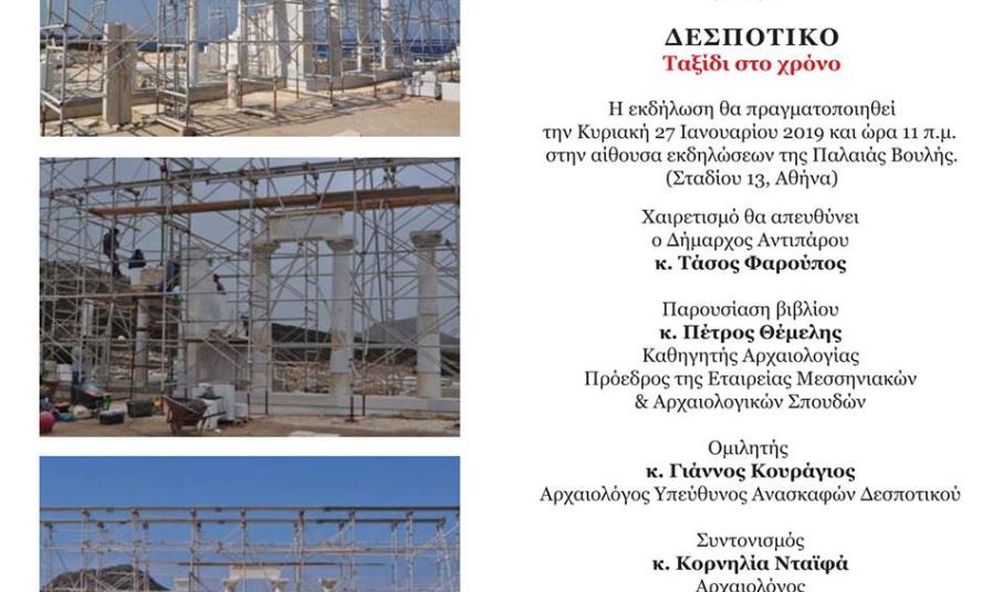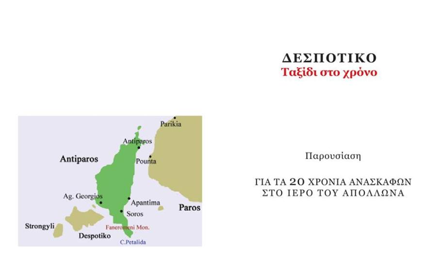 Εκδήλωση για τα 20 χρόνια ανασκαφών στο Δεσποτικό, διοργανώνει ο Σύλλογος Παρίων - Αντιπαρίων "Εκατονταπυλιανή", στο Μέγαρο της Παλαιάς Βουλής στην Αθήνα.