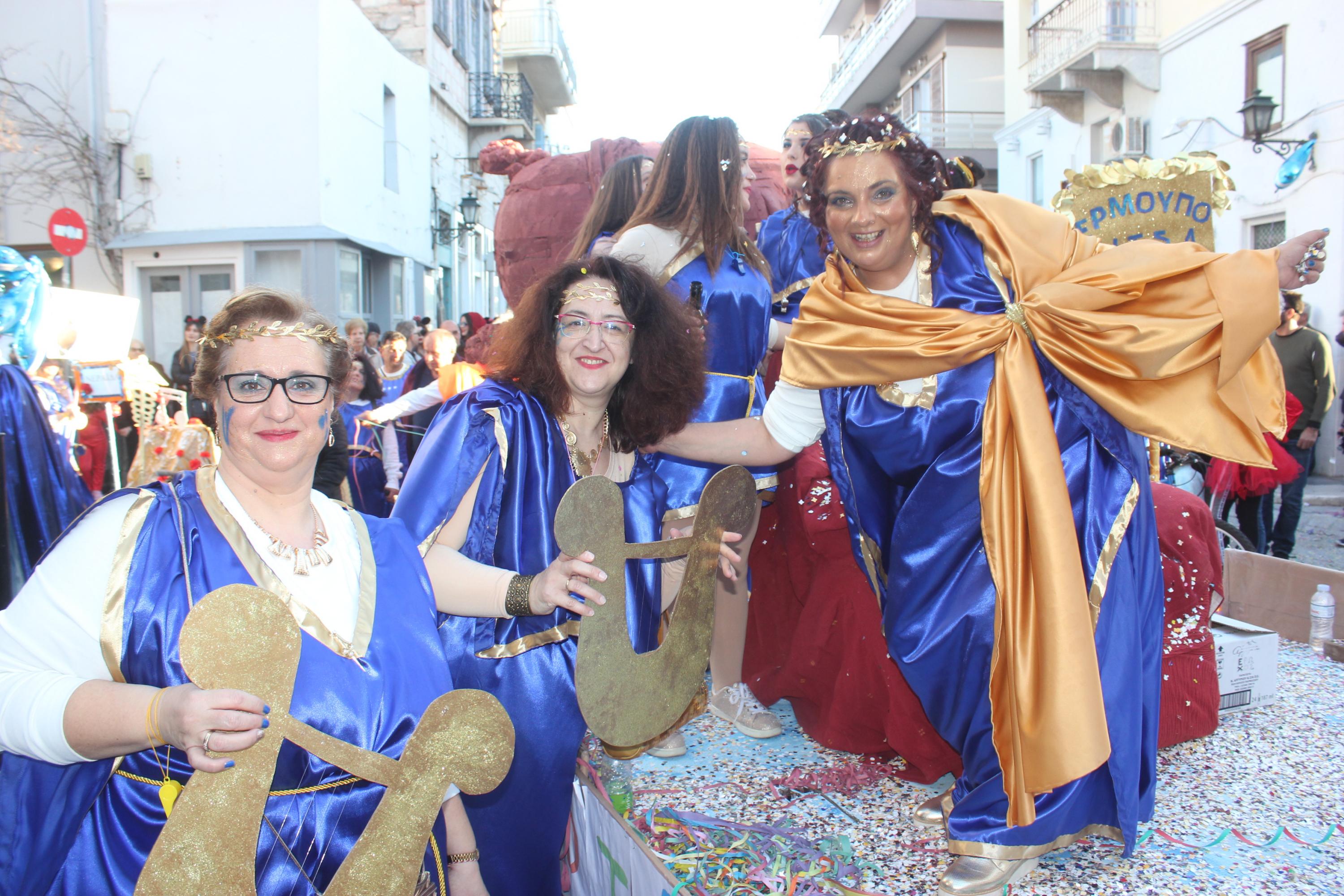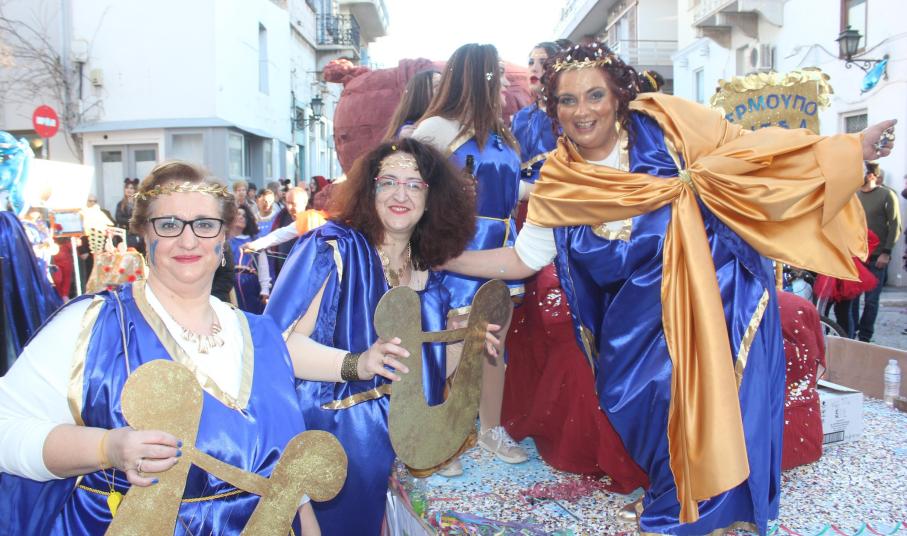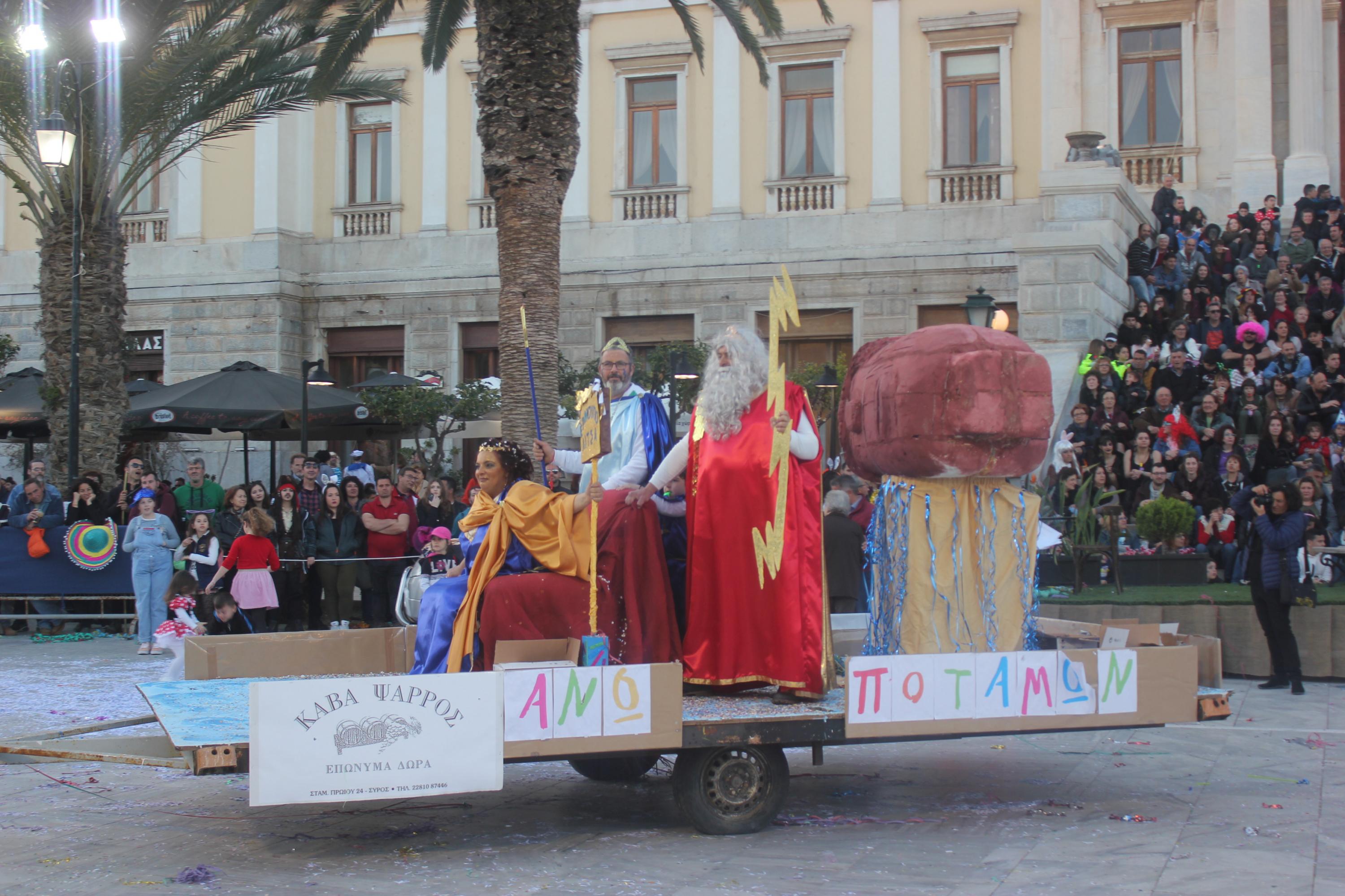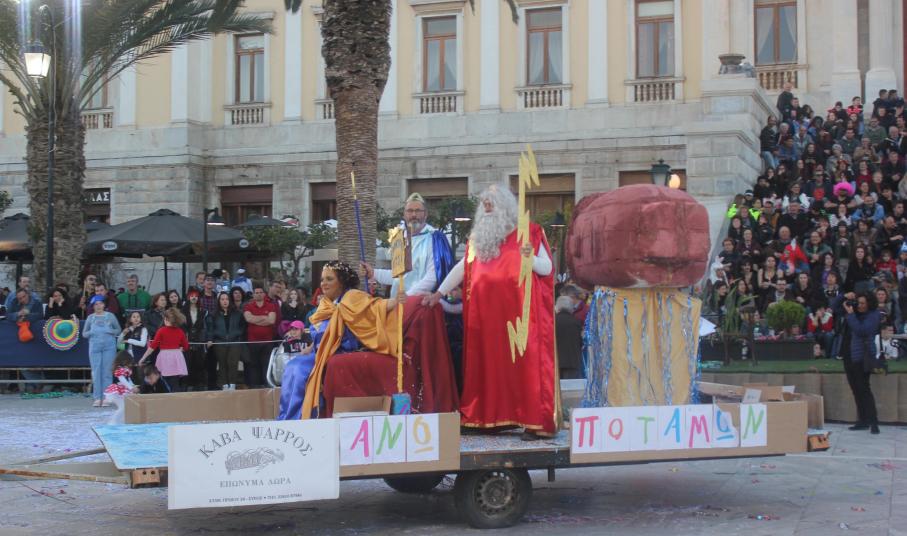 Άκρως σατυρικό για την κατάσταση της πόλης μας ήταν το φετινό θέμα της πολυμήχανης και πολυτάλαντης καρναβαλικής ομάδας των «Άνω Ποταμών», οι οποίοι όχι μόνο δημιουργούν οι ίδιοι τα ρούχα και τα αξεσουάρ τους, αλλά γράφουν και τα δικά τους τραγούδια. Πολύ εύστοχα μάλιστα η Μαριάννα Βακονδίου σχολίασε ότι τα μέλη της είναι πανέτοιμα για τον διαγωνισμό της Eurovision. Ο Ερμής με το ποδηλατάκι του, ο Ποσειδώνας, ο Απόλλωνας, οι φίλοι των Θεών, η Ερμουπο-Λίτσα στο άρμα της και το mini bus που εκτελεί το δρομολόγια «Δόξα-Λύκεια» ήρθαν στον τόπο τους και έκλεψαν τις εντυπώσεις τόσο με το κέφι τους, όσο και με τα σχόλια τους για την τοπική επικαιρότητα.