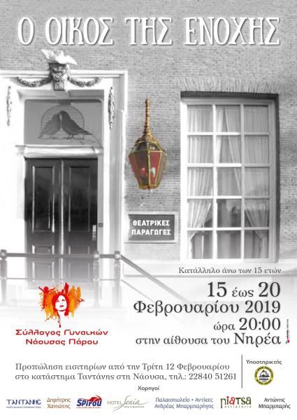 Η θεατρική ομάδα του συλλόγου Γυναικών Νάουσας Πάρου, ιδιαίτερα χαρούμενη μετά την ένταξή της στην ομοσπονδία ερασιτεχνικών θιάσων Αιγαίου, σας προσκαλεί εκ νέου, στις Βραδιές Θεάτρου 2019!