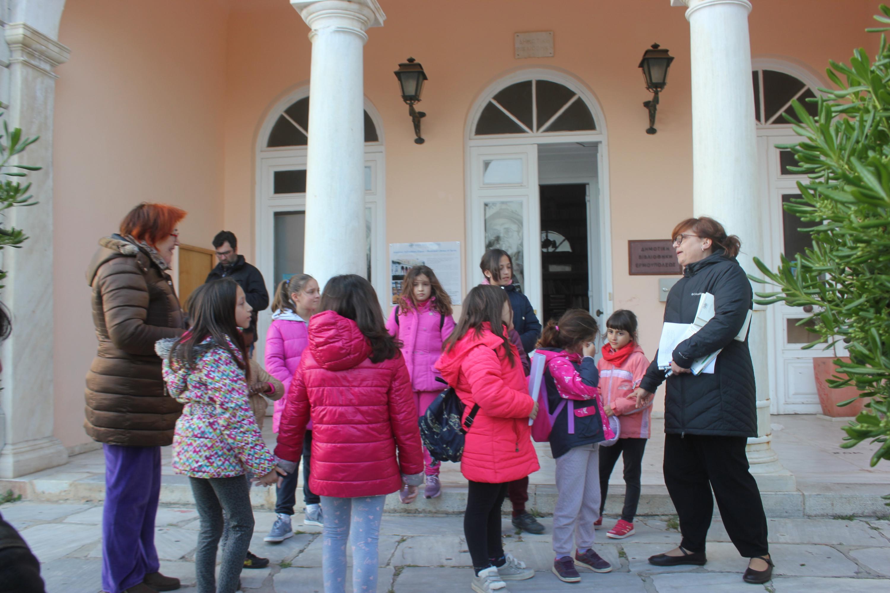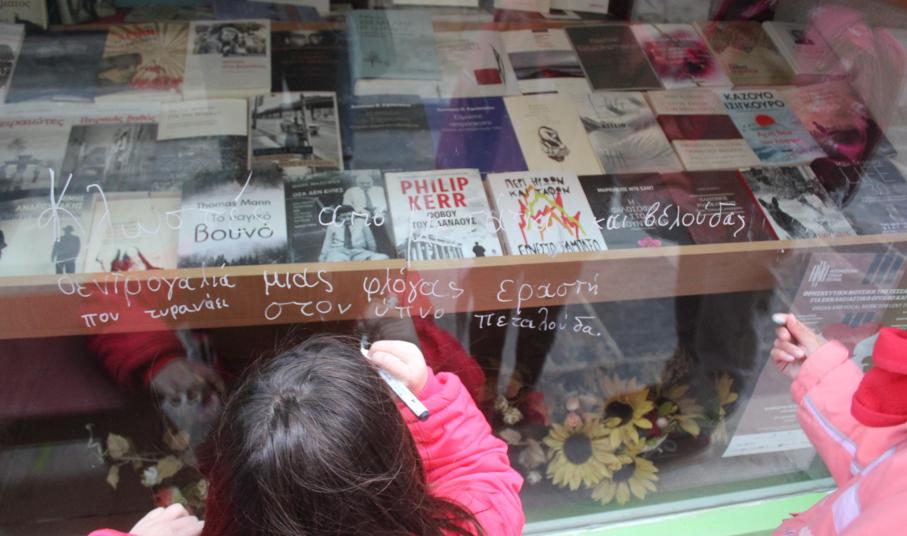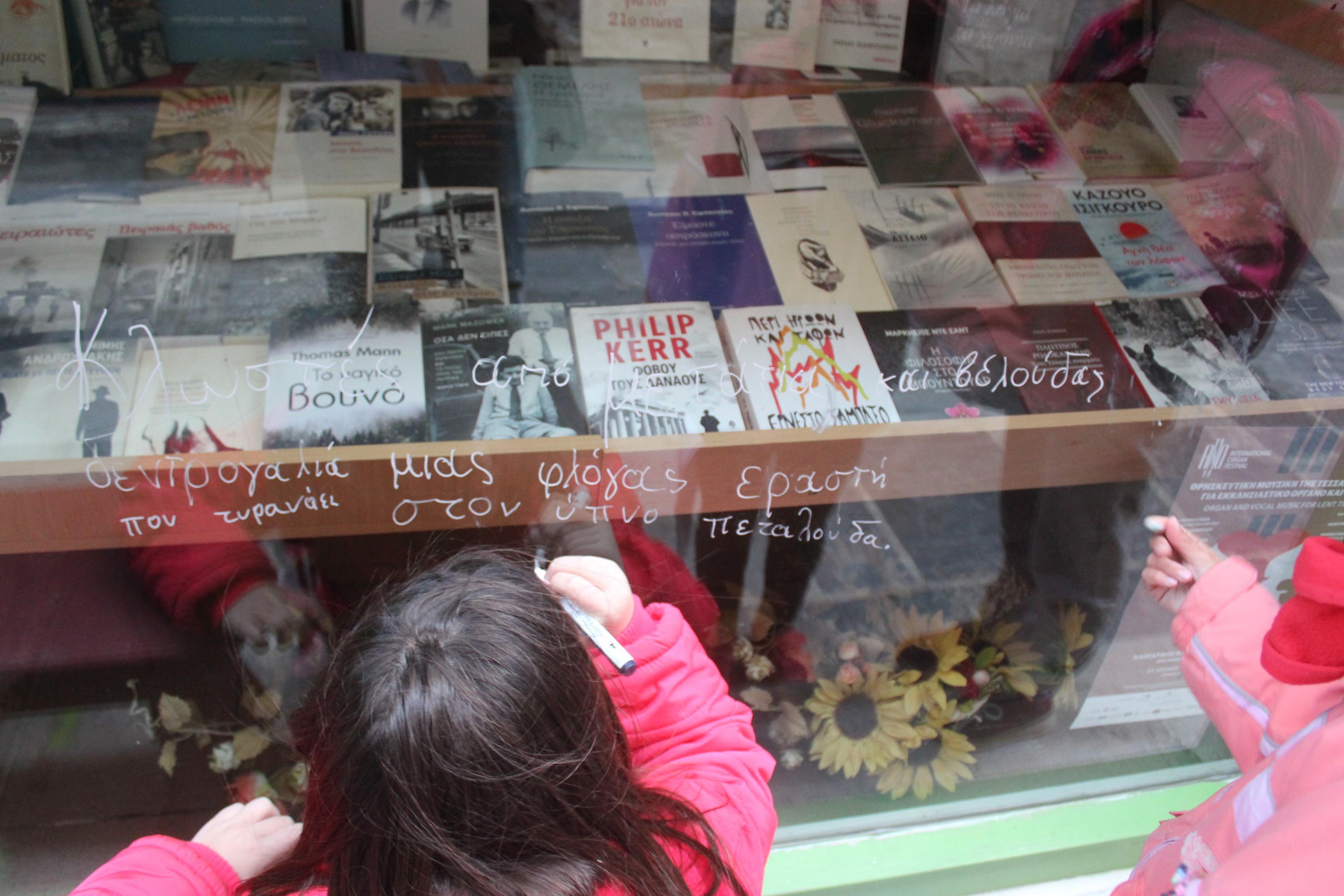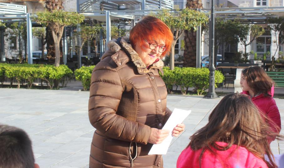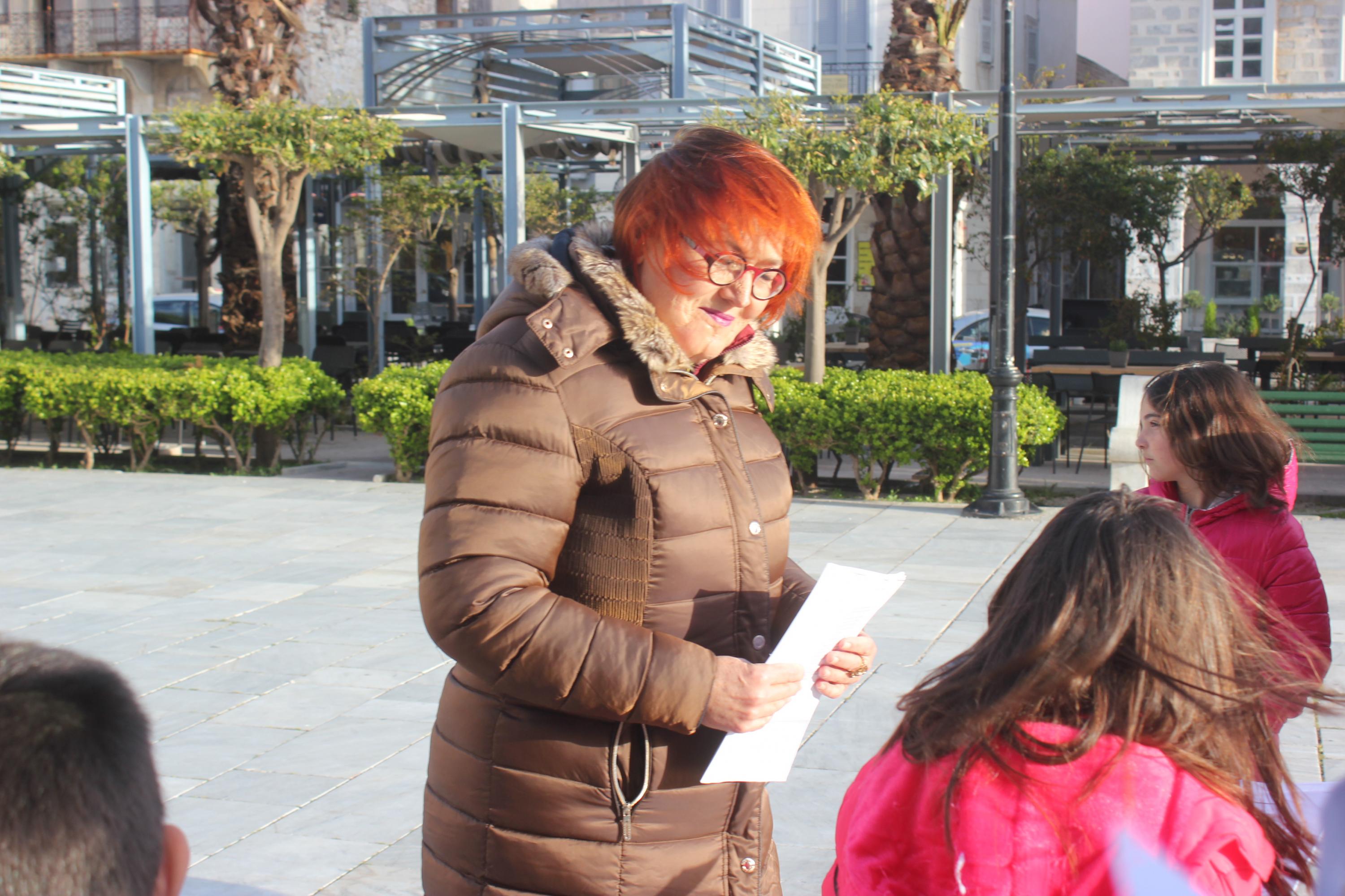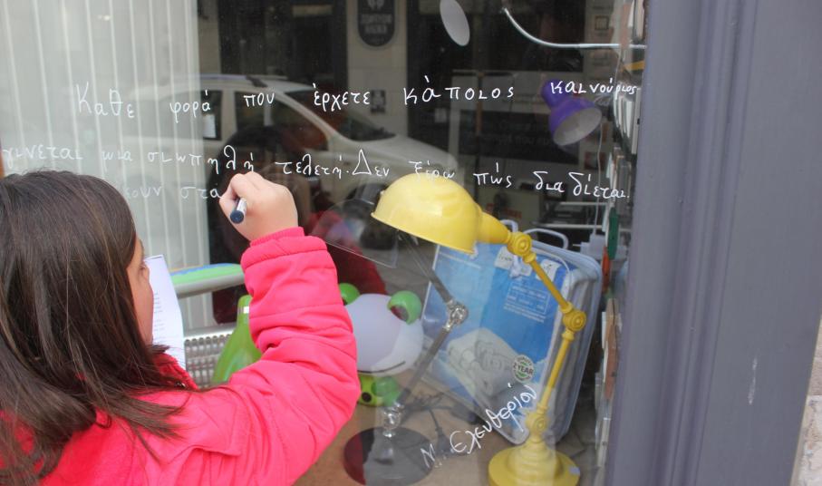Παρά το τσουχτερό κρύο, περισσότερα από δέκα παιδιά ξεχύθηκαν μαζί με τους υπεύθυνους στους δρόμους της Ερμούπολης, διαβάζοντας και γράφοντας στίχους του Μάνου Ελευθερίου, που τραβούσαν την προσοχή πεζών, αλλά και οδηγών.