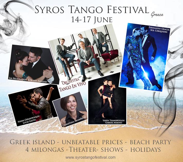 Η 5η κατά σειρά διοργάνωση του Συλλόγου Φίλων Αργεντίνικου Τάνγκο Σύρου θα διεξαχθεί στην πρωτεύουσα των Κυκλάδων από 14 έως 17 Ιουνίου 2019, με καλεσμένους επαγγελματίες χορευτές, οι οποίοι θα μας παρασύρουν στο ρυθμό τους και θα μας μάθουν τα βήματα για την έκφραση του απόλυτου πάθους.