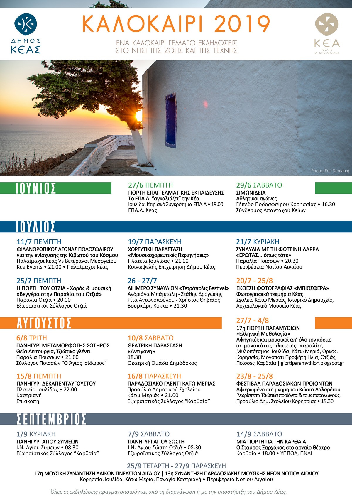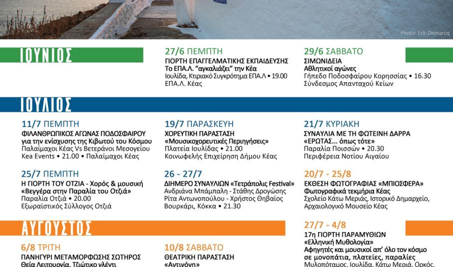 Πολλές μοναδικές στιγμές μας περιμένουν μέχρι το Σεπτέμβριο στο νησί της Κέας: στιγμές πολιτισμού, τέχνης, μουσικής, διασκέδασης και ψυχαγωγίας, αλλά και αυθεντικές τζιώτικες στιγμές. Πανηγύρια, συναυλίες, φεστιβάλ και παραστάσεις, η Γιορτή Παραμυθιών αλλά και “Μια γιορτή για την Καρθαία” θα γεμίσουν τις μέρες και τις νύχτες μας αυτό το καλοκαίρι!
