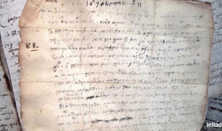 Εν έτι 1671 μηνί Ιανουαρίω ημέρα δεκάτη εν Σύρω. Eν ονόματι της Αγίας Τριάδος και της Κοκκίνης προστάτιδος της νήσου Σύρου Προκοσύμφωνον της πρώτης μας κόρης και της θυγατρός του Κωστάκη και της Σμαράγδας και της μακαρίτισσας της γυναικός μου Πιπινίτσας ήτις θα πάρη νόμιμον σύζυγον τον Ντεμογιαννάκη του Κωνσταντάκη της Πιπινίτσας Πηνελόπης Βαρβαρίτσας.