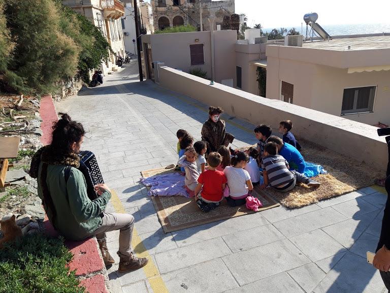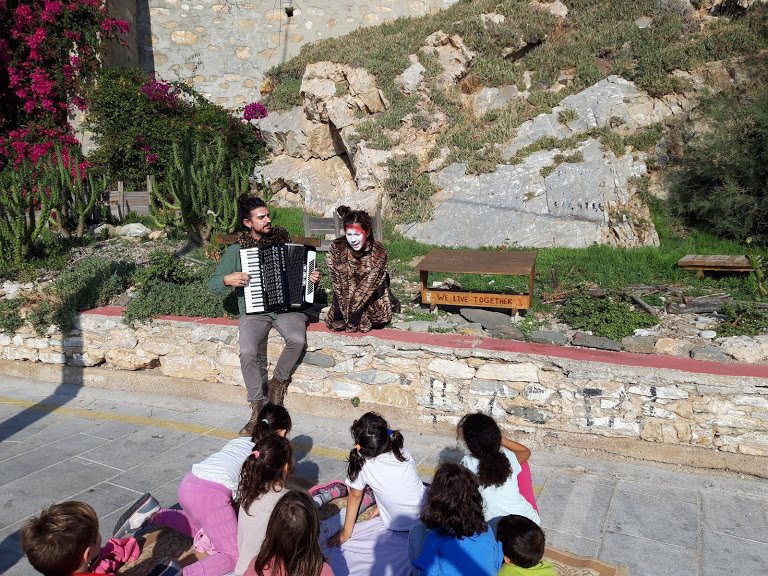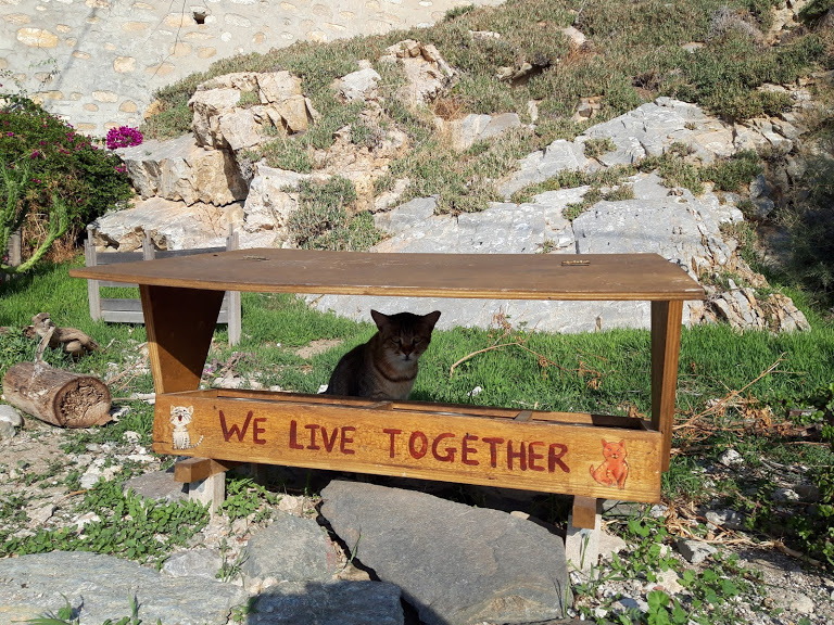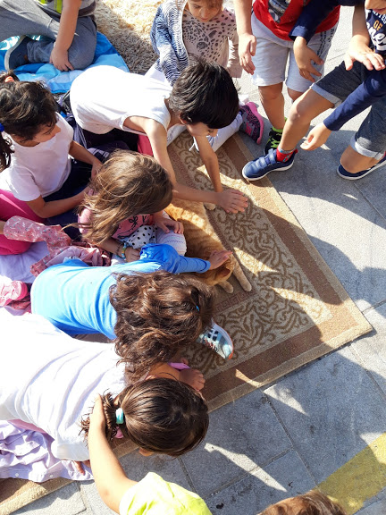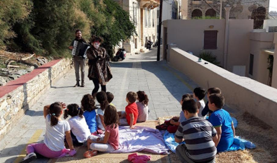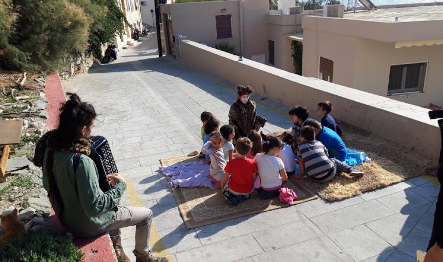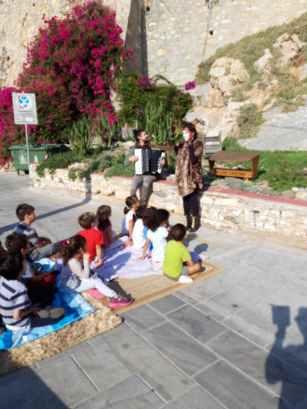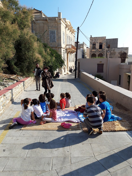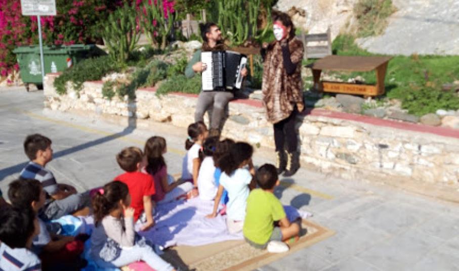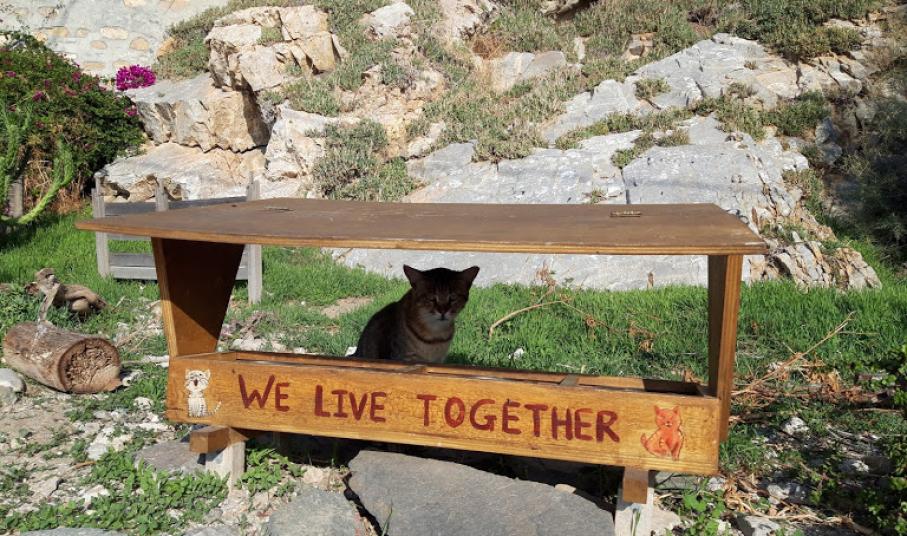 Μία από τις ιστορίες αυτές άκουσαν το πρωί της Τρίτης μαθητές και μαθήτριες του 3ου Δημοτικού Σχολείου, στο γάτο-καφενείο, στα Βαπόρια. Ανάλογες παραστάσεις θα δοθούν προσεχώς και σε άλλα σημεία του νησιού, όπου κάτοικοι με τη συμβολή κτηνιάτρων κατασκεύασαν γάτο-καφενεία (συνολικά δέκα), συμπράττοντας στην ευζωία (βελτίωση των συνθηκών διαβίωσης και της υγείας των ζώων) και ταυτόχρονα στην αναβάθμιση του  τοπίου της γειτονιάς.
