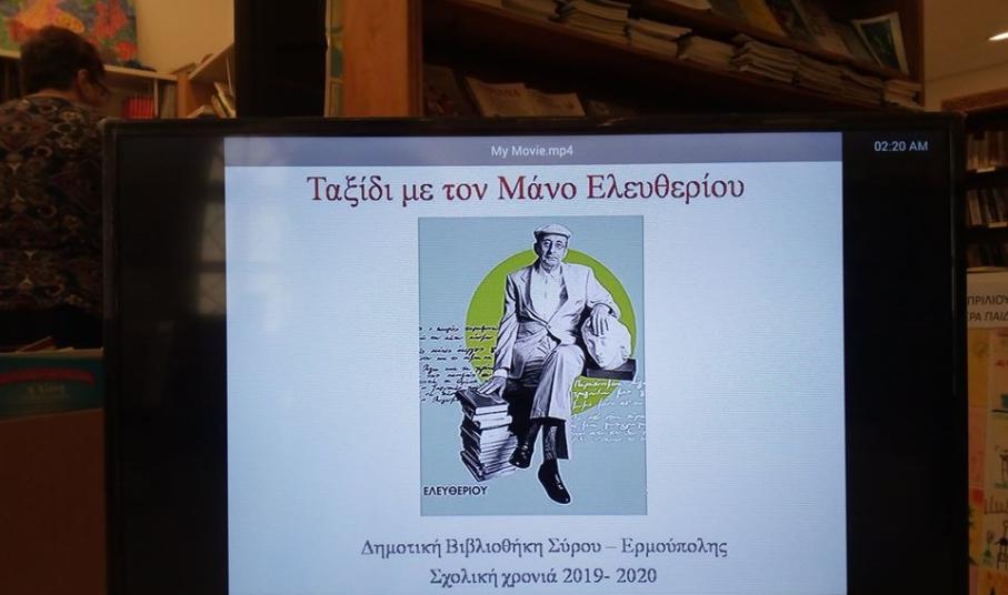 Κατά τη διάρκεια της δράσης, παρουσιάστηκε οπτικοακουστικό υλικό, το οποίο επιμελήθηκε η Σοφία Δεσύπρη. Οι μαθητές ενημερώθηκαν για τη λαμπρή διαδρομή του Μάνου Ελευθερίου στα πεδία της ποίησης, της λογοτεχνίας και της στιχουργικής, την ενασχόλησή του με τη συγγραφή σπουδαίων μελετών όπως «Το Θέατρο στην Ερμούπολη», αλλά και για τα ιδιαίτερα αισθήματα που έτρεφε τόσο για την πατρίδα του όσο και για δομές και φορείς που φρόντιζε μέχρι τέλους, όπως η Βιβλιοθήκη της Σύρου.