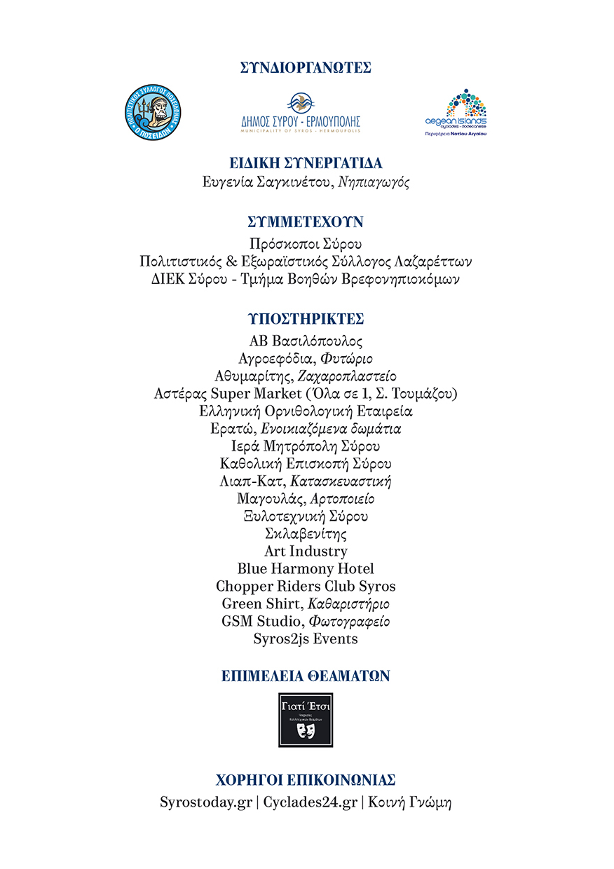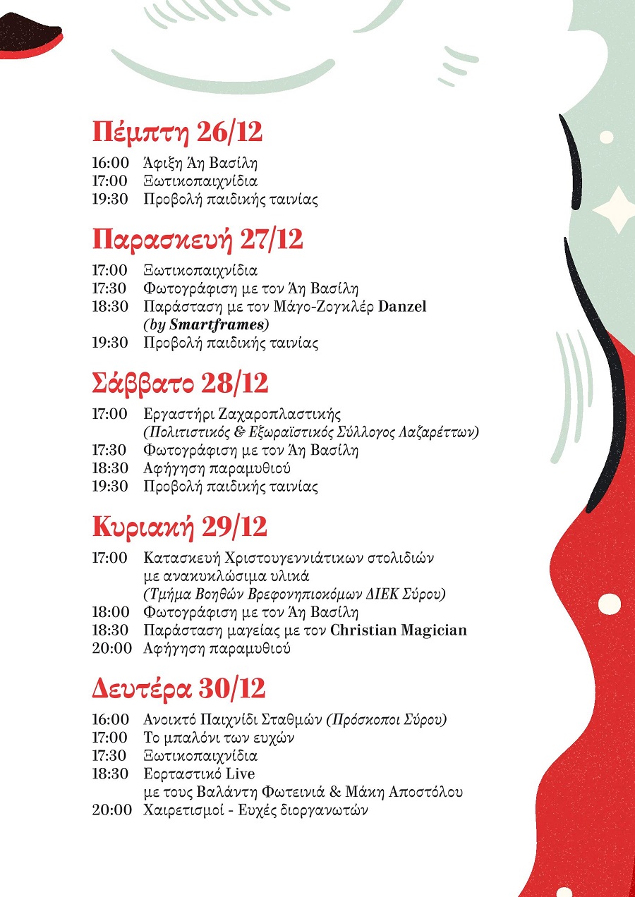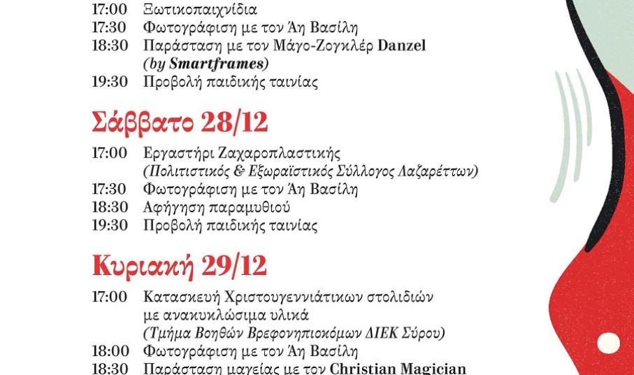 Στο πλαίσιο του Πολιτιστικού Προγράμματος του Δήμου Σύρου- Ερμούπολης «Χριστούγεννα Μαζί», ο Πολιτιστικός Σύλλογος «Ο Ποσειδών» σε συνδιοργάνωση με την Περιφέρεια Νοτίου Αιγαίου πραγματοποιεί για 8η συνεχόμενη χρονιά τη μεγαλύτερη Χριστουγεννιάτικη εκδήλωση της Σύρου και των Κυκλάδων, για να απολαύσουν όλοι με ξεχωριστό τρόπο τις γιορτές των Χριστουγέννων και της Πρωτοχρονιάς.
