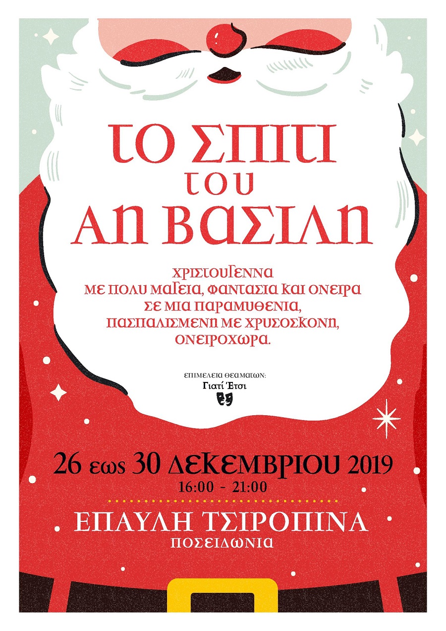 Η Έπαυλη Τσιροπινά στην Ποσειδωνία, για πέντε ημέρες, από 26 έως 30 Δεκεμβρίου 2019, από ώρες 16:00-21:00, μεταμορφώνεται στο «Σπίτι του Άη Βασίλη».