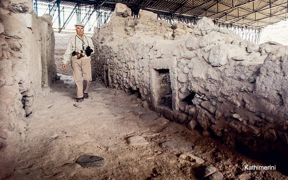 Ο καθηγητής, μετά τον πόλεμο του 1940, εκτός από τα διδακτικά του καθήκοντα στο Πανεπιστήμιο, είχε κάνει σημαντικές ανασκαφικές έρευνες και εκτός της Κρήτης ή των Κυκλάδων. Είχε ανασκάψει στις Θερμοπύλες, στον Μαραθώνα, στη Μεσσηνία, στην Κεφαλλονιά και αλλού, φέρνοντας στο φως σπουδαία μνημεία. Με ιδιαίτερη φροντίδα, θέλησε το 1939 να επισκεφθεί τη Σαντορίνη (Θήρα) για να γνωρίσει το χώρο του νησιού και να επιβεβαιώσει ότι πραγματικά ο Μινωικός πολιτισμός καταστράφηκε από την έκρηξη του ηφαιστείου αυτού του νησιού. Τελικά, η άποψη αυτή αποδείχθηκε στο Ακρωτήρι, το οποίο, όπως και ο καθηγητής αποδέχθηκε, αποτελεί την σημαντικότερη προϊστορική πόλη του Αιγαίου, με πολύ καλό πολεοδομικό σύστημα, δημόσια και ιδιωτικά πολυώροφα κτίρια διακοσμημένα με τοιχογραφίες και πλήθος κινητών ευρημάτων όλων των κατηγοριών (και εγχώρια και ξένης κατασκευής). Με αφορμή τα τόσα άριστα ευρήματα, αποδέχθηκε και μετέφερε στους ανθρώπους τον αρκετά σημαντικό πολιτισμό που υπήρχε στο νησί. Και αυτό το νησί, κάποτε ήταν πολύ μεγάλο, αλλά η έκρηξη του ηφαιστείου... έστειλε το μισό νησί στο βυθό της θάλασσας. Αυτή η έκρηξη ήταν μια από τις μεγαλύτερες στην Ιστορία. Από αυτό το στοιχείο οι ηφαιστειολόγοι εκτιμούν ότι το αρχαίο ηφαίστειο εκτόξευε δύο ως τρεις φορές περισσότερους βράχους και στάχτη. Η έκρηξη στη Σαντορίνη θα πρέπει να ήταν τεράστια.