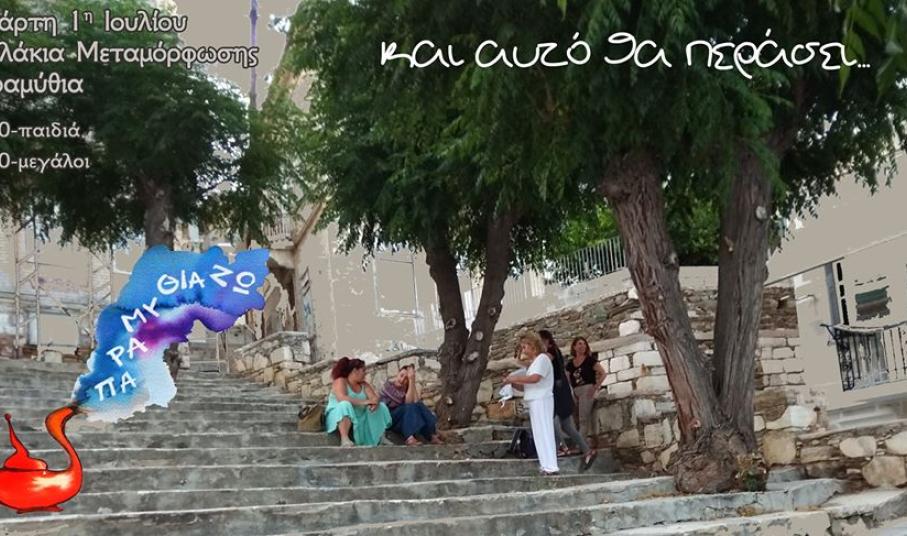 Τηρώντας πιστά τα μέτρα υγιεινής και ασφάλειας (μάσκες, απόσταση 1,5 μέτρο ο ένας από τον άλλον), οι «παραμυθάδες» της πρωτεύουσας των Κυκλάδων αποφάσισαν αυτή τη φορά να σχηματίσουν τον κύκλο τους στα σκαλάκια της Μεταμόρφωσης, σαν παρεάκι, σαν τα παιδιά που μαζεύονται στις πλατείες για να τα πούνε κι εκεί να αφήσουν τα παραμύθια να ξεχυθούν, σαν κουβεντούλα φιλική. Η δράση με τίτλο «και αυτό θα περάσει…» θα πραγματοποιηθεί αύριο το απόγευμα έμπροσθεν του Ιερού Μητροπολιτικού Ναού Μεταμορφώσεως του Σωτήρος, στην Ερμούπολη.