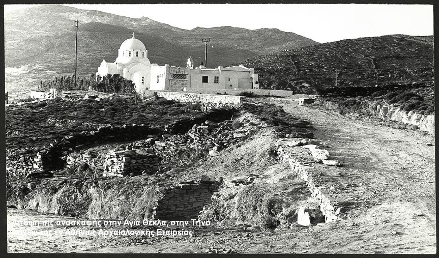 Στο επίκεντρο βρίσκονται τα ευρήματα του σπάνιου για ολόκληρο το Αιγαίο μυκηναϊκού θολωτού τάφου στην Αγία Θέκλα, στη βόρεια Τήνο. Το μικρών διαστάσεων μνημείο, το οποίο υπήρξε και η αφορμή για τη δημιουργία της έκθεσης, αποκαλύφθηκε κατά τις εργασίες διάνοιξης δρόμου και τα υπολείμματά του ερευνήθηκαν από τον αείμνηστο τηνιακό αρχαιολόγο Γεώργιο Δεσπίνη, το 1979. Πρόκειται για έναν από τους μόλις τρεις γνωστούς θολωτούς μυκηναϊκούς τάφους στις Κυκλάδες και αποτελεί τη μοναδική, προς το παρόν, επιβεβαιωμένη μυκηναϊκή θέση στο νησί. Τόπος ταφής ενός γένους «αριστοκρατών», ο τάφος της Αγίας Θέκλας (13ος-12ος αι. π.Χ.) είχε χρησιμοποιηθεί για πολλαπλές ταφές. Τα ευρήματά του (αγγεία, κοσμήματα, χάλκινα αντικείμενα) αποτελούν πολύτιμη πηγή πληροφοριών για τις ταφικές πρακτικές, την κοινωνική οργάνωση και την τέχνη στις Κυκλάδες των τελευταίων αιώνων της 2ης χιλιετίας π.Χ.